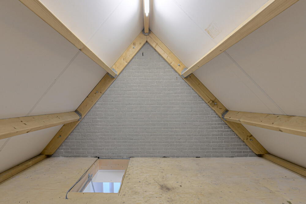 Overloop met trapopgang naar de zolderverdieping alsmede een luik met vlizotrap naar de extra bergzolder van de opbouw.Slaapkamer i