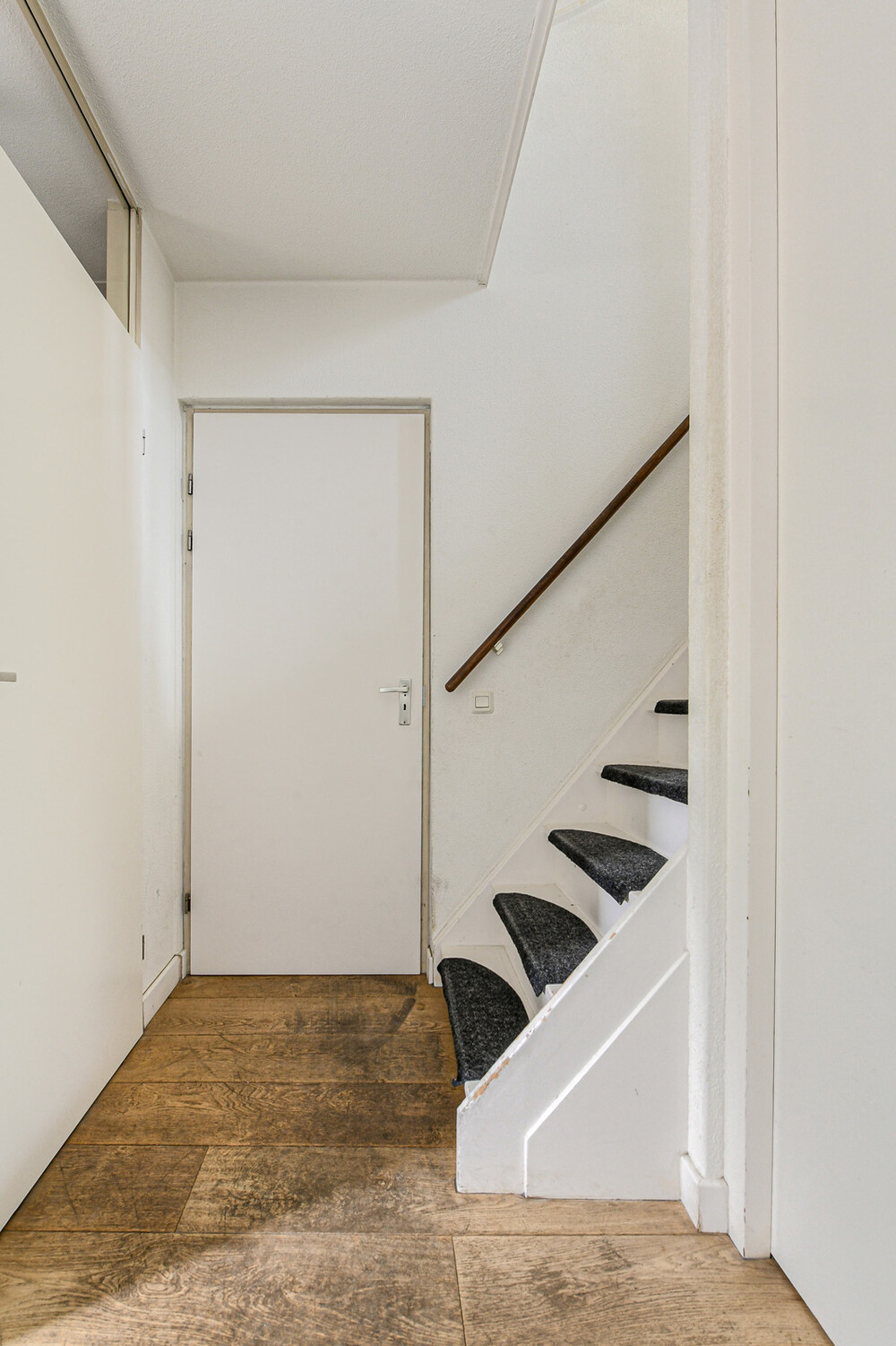 Overdekte entree in hal met een houten vloer, trapopgang naar de eerste verdieping en meterkast (voorzien van 12 groepen, PVgroep en aardlekbeveiliging).Toilet