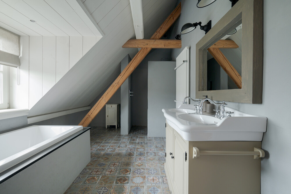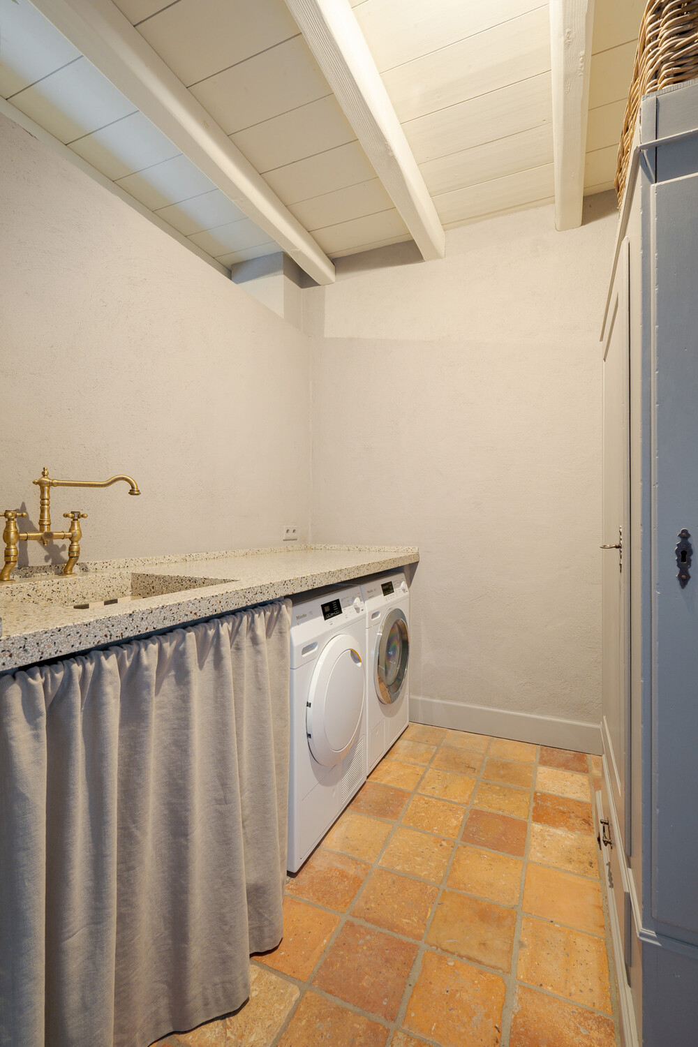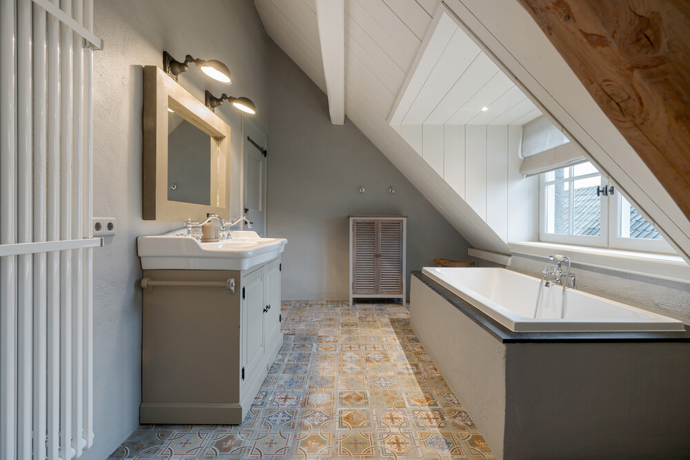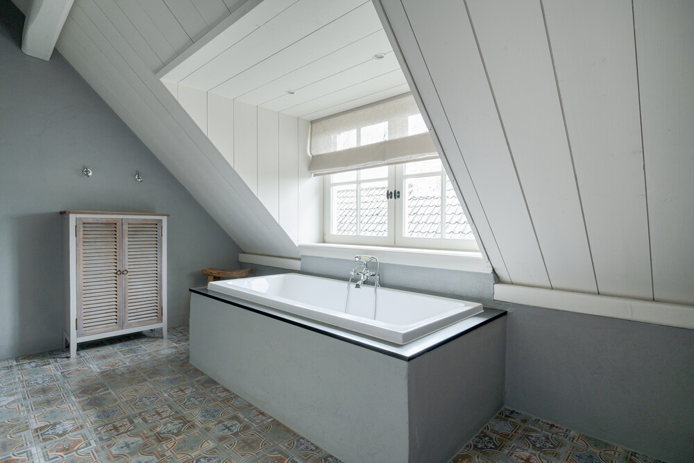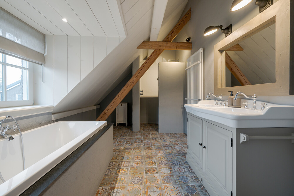 Een ruime tweede badkamer met een afwerking, vergelijkbaar met badkamer één; luxe vloerbetegeling en stucwerk wandafwerking. Deze badkamer biedt een inloopdouche met hand- en regendouche, een ligbad en een dubbele wastafel in een meubel. Bij deze badkamer is een grote dakkapel geplaatst.Berging/inloopkast