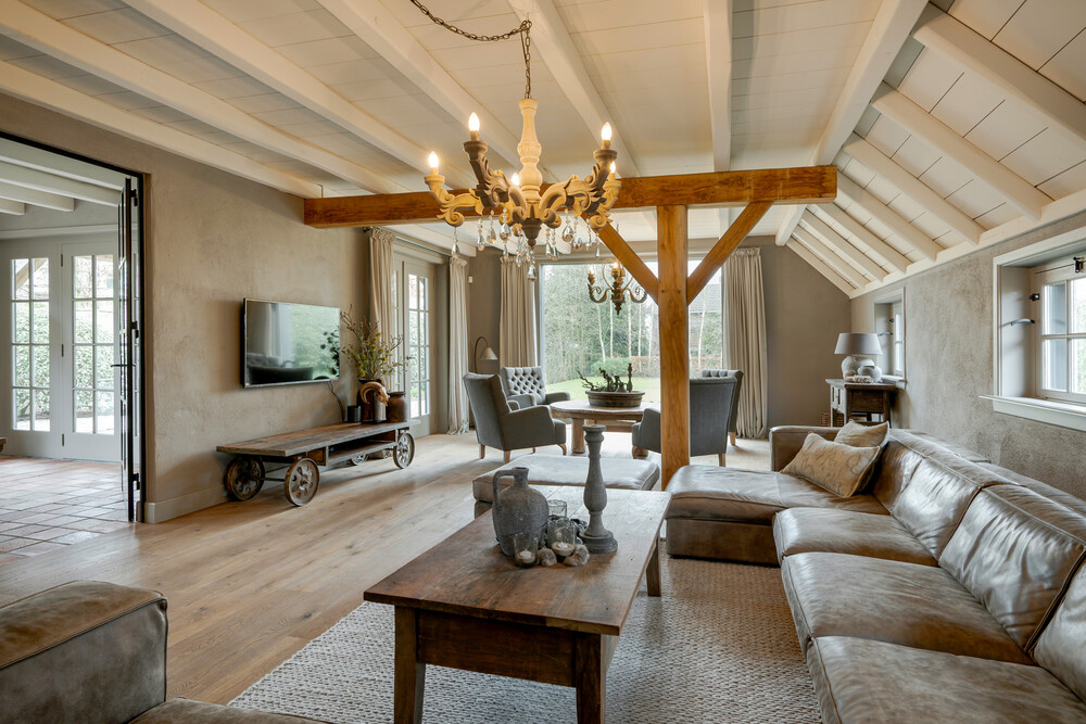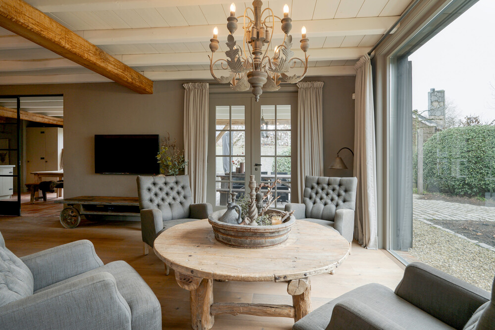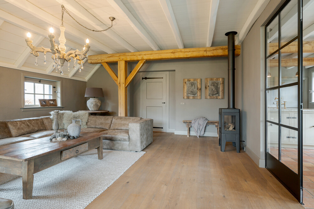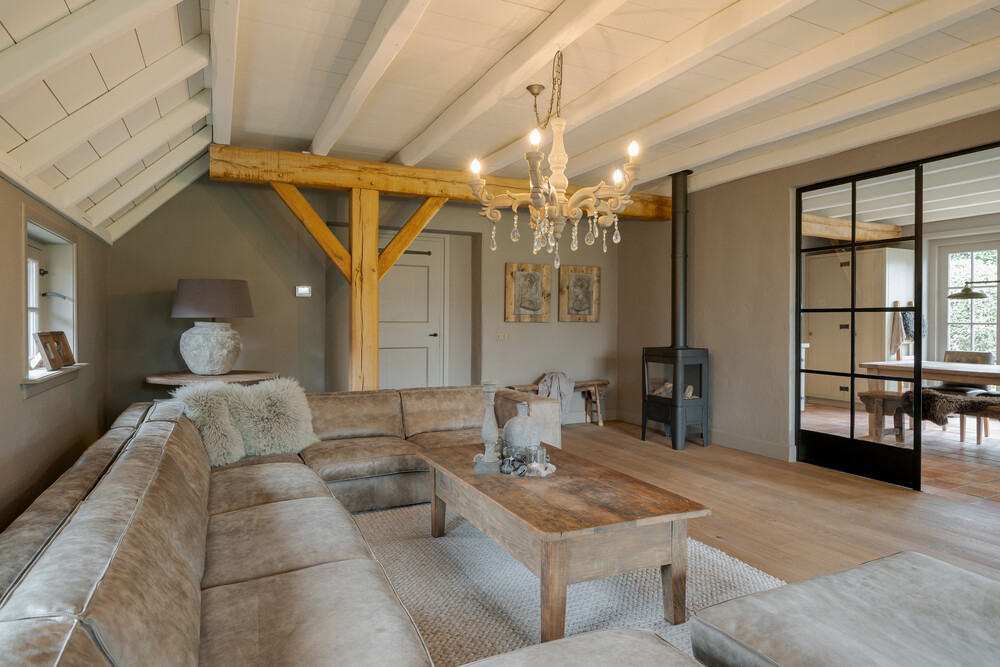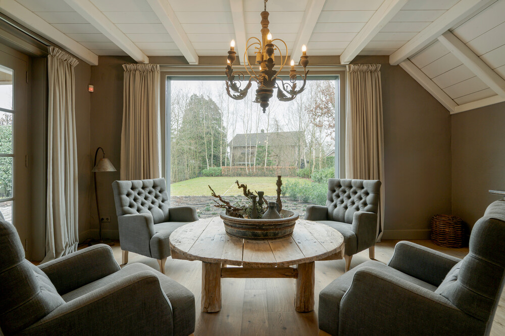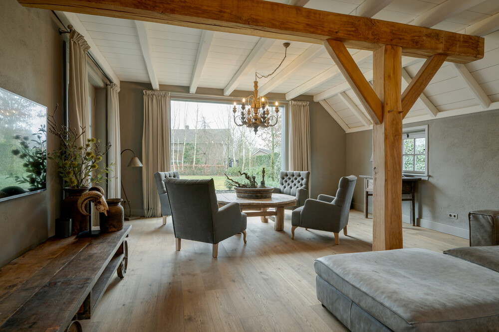 De ruime woonkamer is vanuit de eerder genoemde hal bereikbaar en biedt door de ruimte vele mogelijkheden. Op dit moment is de zijde van de keuken als een riante zit-/tv-hoek in gebruik; hier is ook een gashaard geplaatst. Aan de achterzijde, (middels een grote glaspartij prachtig zicht op de tuin), is een tweede zithoek gerealiseerd. Openslaande deuren verbinden deze ruimte met het overdekte terras. De sfeervolle woonkamer is uitgerust met een parketvloer, uitgevoerd in brede delen. Ook is bij het plafond de balkenconstructie in het zicht gebleven.Woon-/eetkeuken