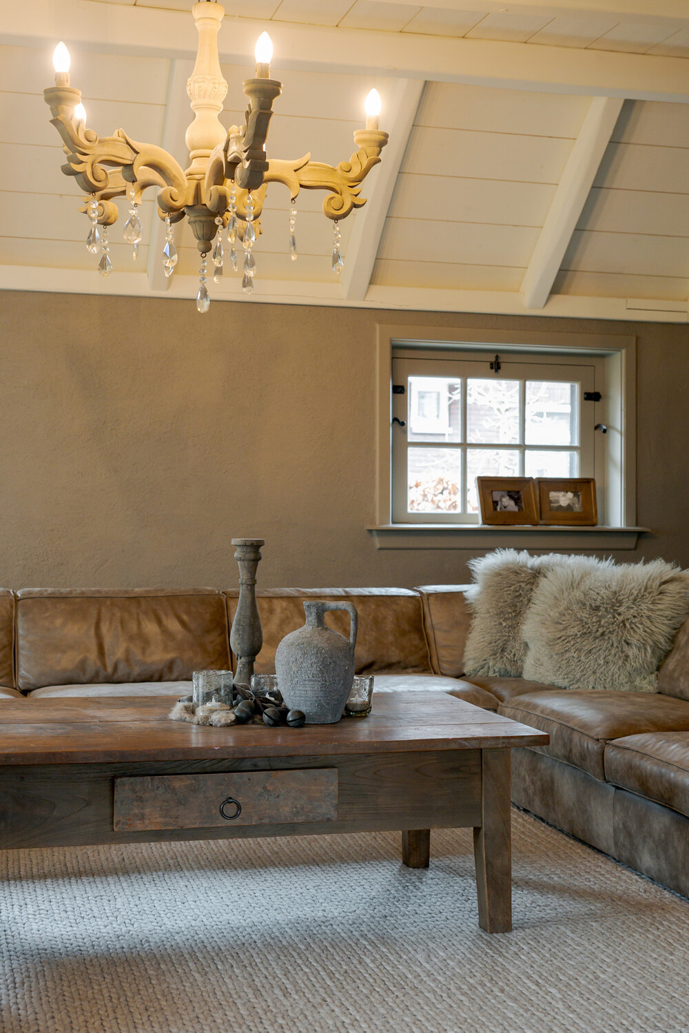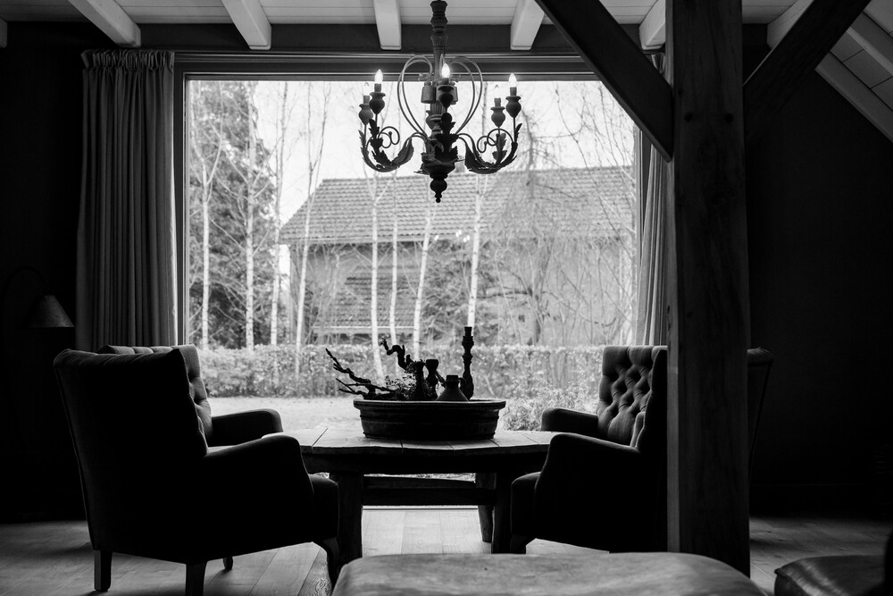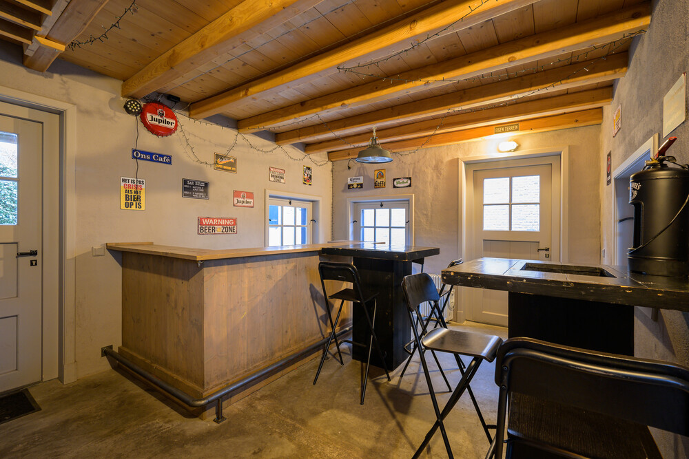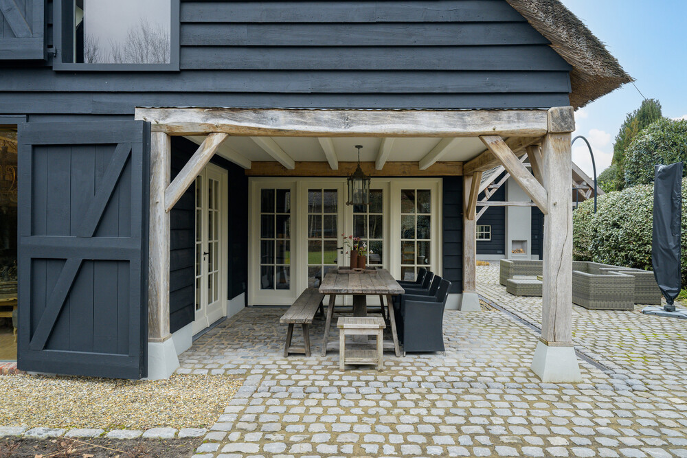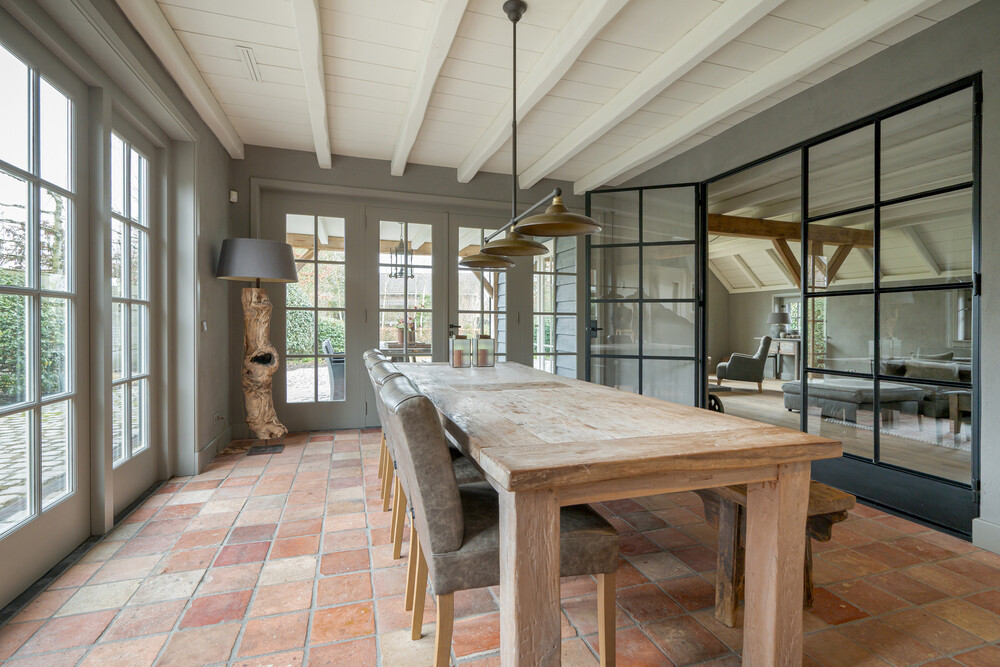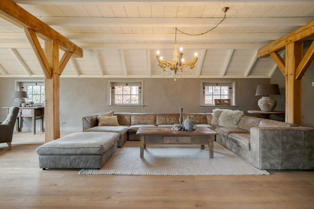 De ruime woonkamer is vanuit de eerder genoemde hal bereikbaar en biedt door de ruimte vele mogelijkheden. Op dit moment is de zijde van de keuken als een riante zit-/tv-hoek in gebruik; hier is ook een gashaard geplaatst. Aan de achterzijde, (middels een grote glaspartij prachtig zicht op de tuin), is een tweede zithoek gerealiseerd. Openslaande deuren verbinden deze ruimte met het overdekte terras. De sfeervolle woonkamer is uitgerust met een parketvloer, uitgevoerd in brede delen. Ook is bij het plafond de balkenconstructie in het zicht gebleven.Woon-/eetkeuken