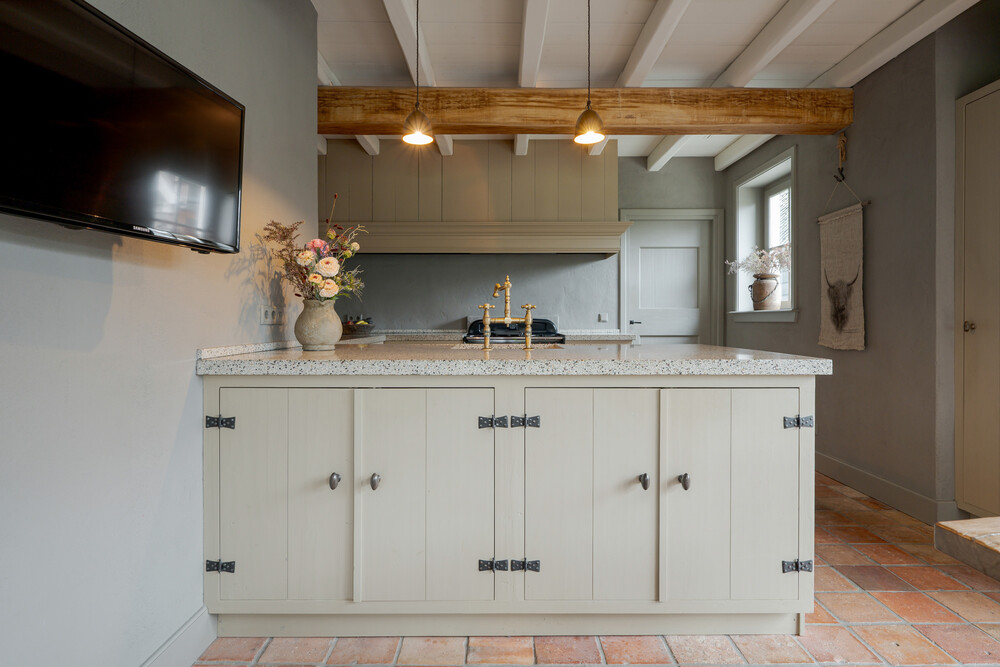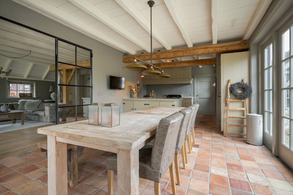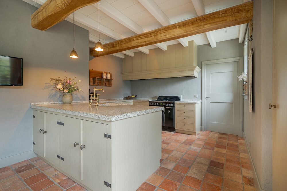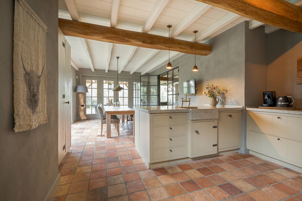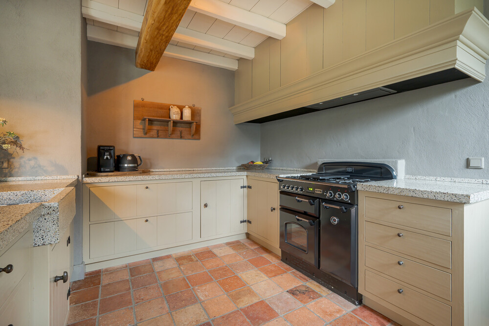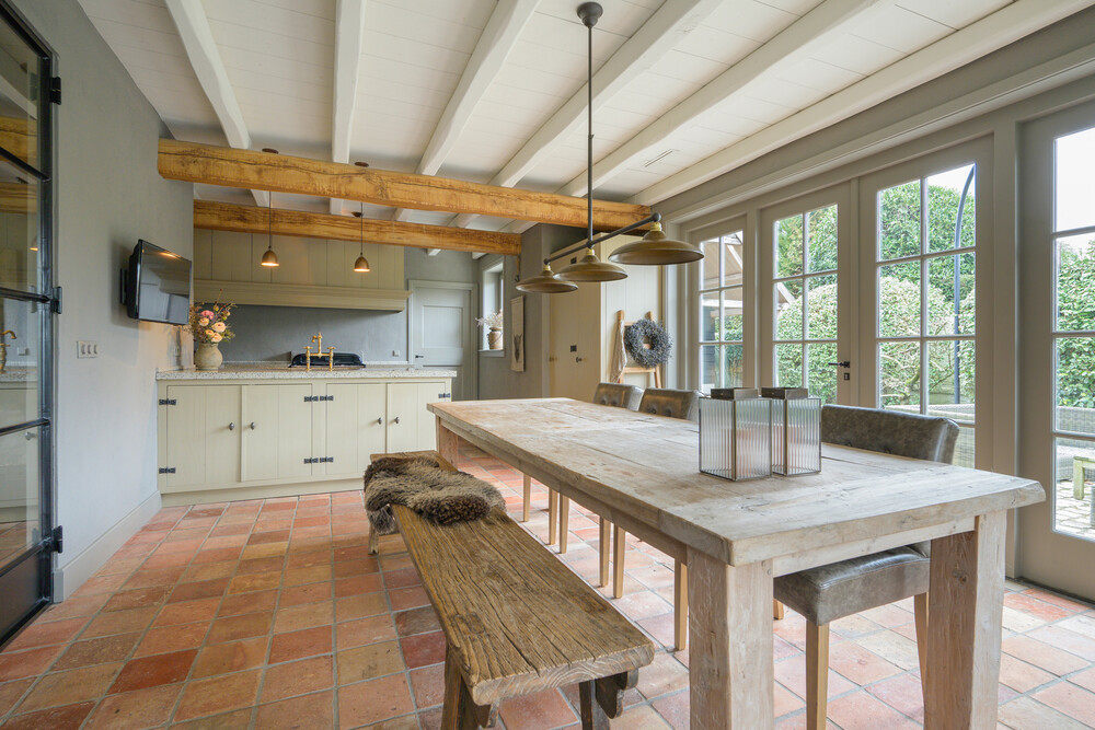 De woon-/eetkeuken grenst aan de woonkamer en is voorzien van een inrichting in U-opstelling, bestaand uit een granitoblad met betegelde spoelbak, een vaatwasser, een 90 cm breed Falcon gasfornuis met meerdere ovens en daarboven een in het meubel geïntegreerde afzuigkap. Verder treft u onder het aanrecht veel bergruimte in kasten en laden. In het wandmeubel is een grote koelkast geplaatst, alsmede een apothekerskast.Aan de tuinzijde van de keuken is de eethoek gesitueerd. Openslaande deuren verbinden de keuken met het eerder genoemde overdekte terras; tevens verbinden openslaande deuren de keuken met het zijterras.