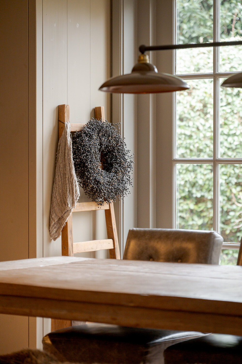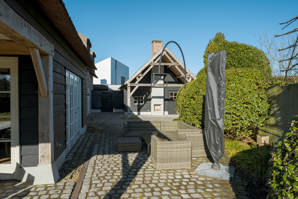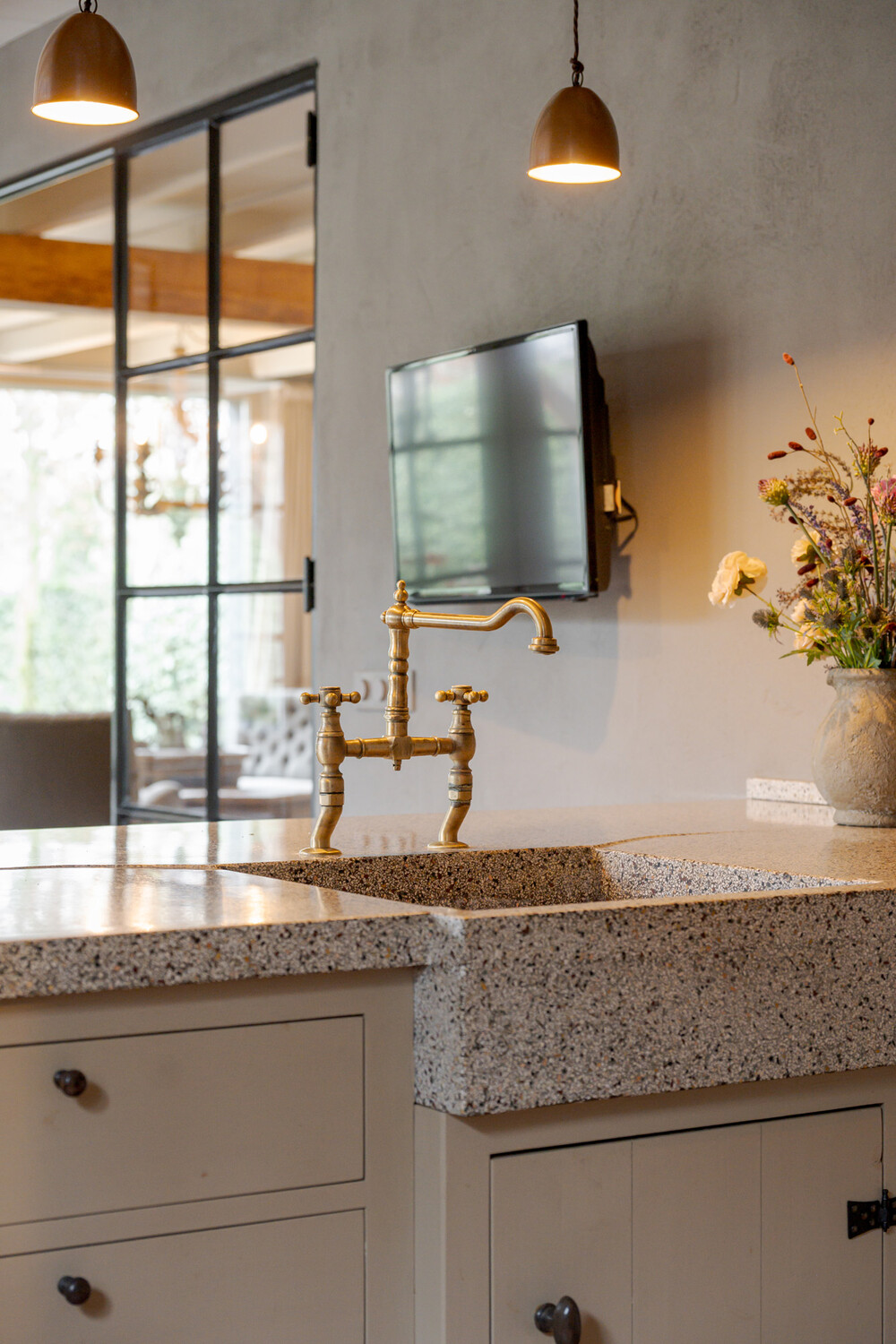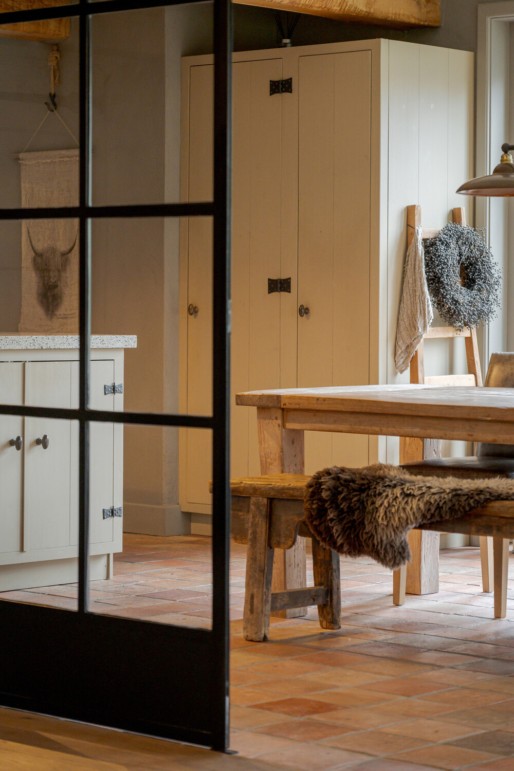 De woon-/eetkeuken grenst aan de woonkamer en is voorzien van een inrichting in U-opstelling, bestaand uit een granitoblad met betegelde spoelbak, een vaatwasser, een 90 cm breed Falcon gasfornuis met meerdere ovens en daarboven een in het meubel geïntegreerde afzuigkap. Verder treft u onder het aanrecht veel bergruimte in kasten en laden. In het wandmeubel is een grote koelkast geplaatst, alsmede een apothekerskast.Aan de tuinzijde van de keuken is de eethoek gesitueerd. Openslaande deuren verbinden de keuken met het eerder genoemde overdekte terras; tevens verbinden openslaande deuren de keuken met het zijterras.