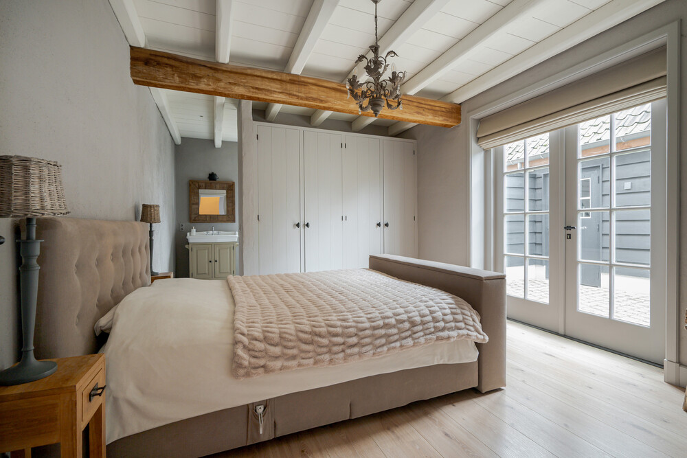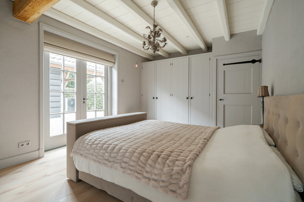 Slaapkamer, aan de achterzijde van de woning gelegen. Deze ruime slaapkamer is aan weerszijden voorzien van ruime garderobekasten. Ook de slaapkamer is middels dubbele deuren verbonden met de (zij)tuin. Aangrenzend treft u de badkamer.Badkamer
