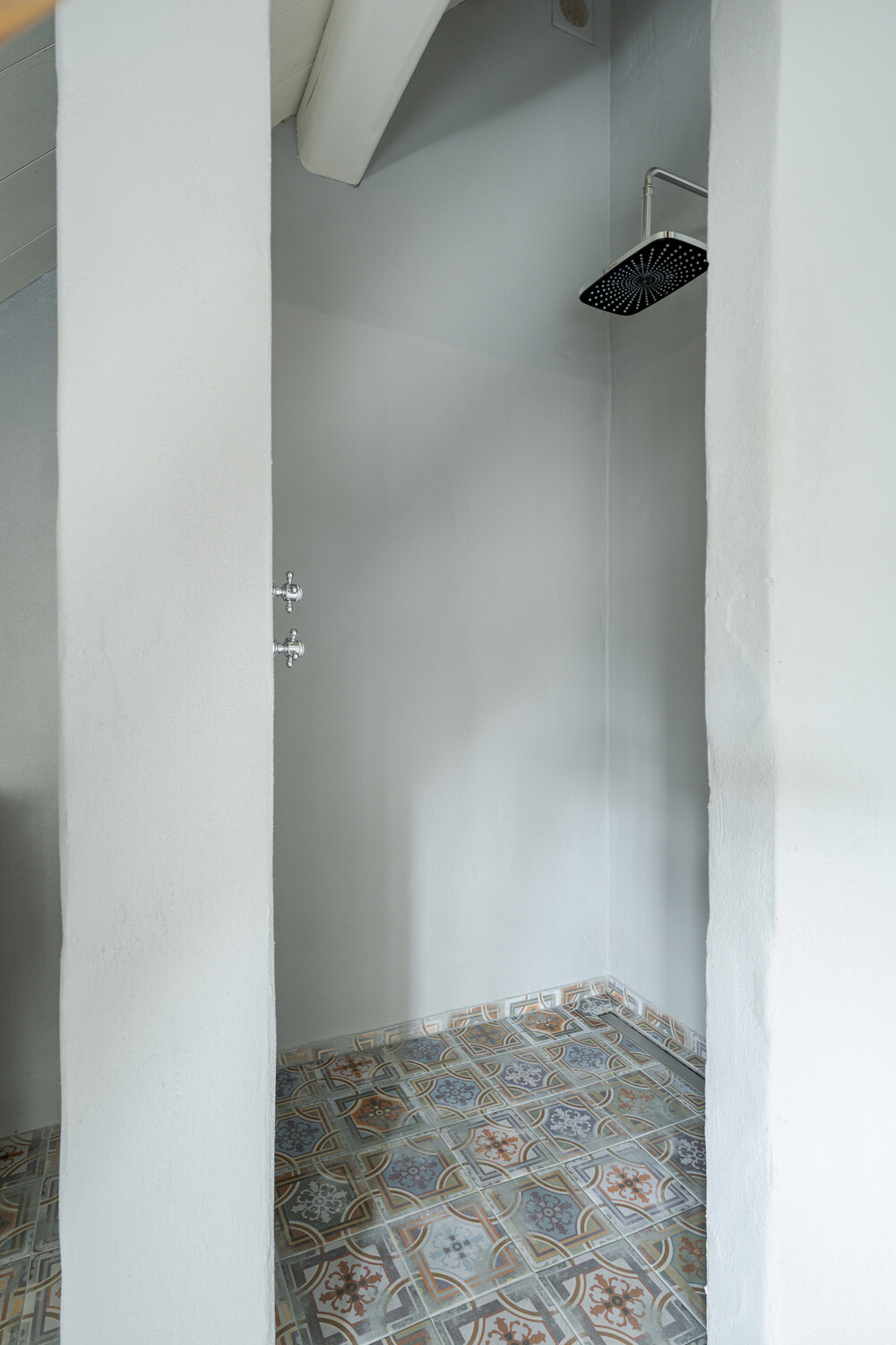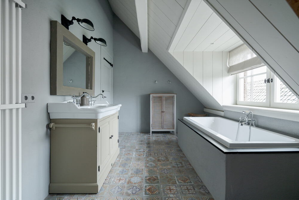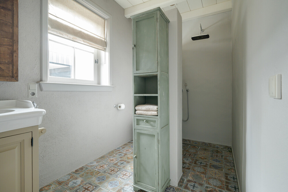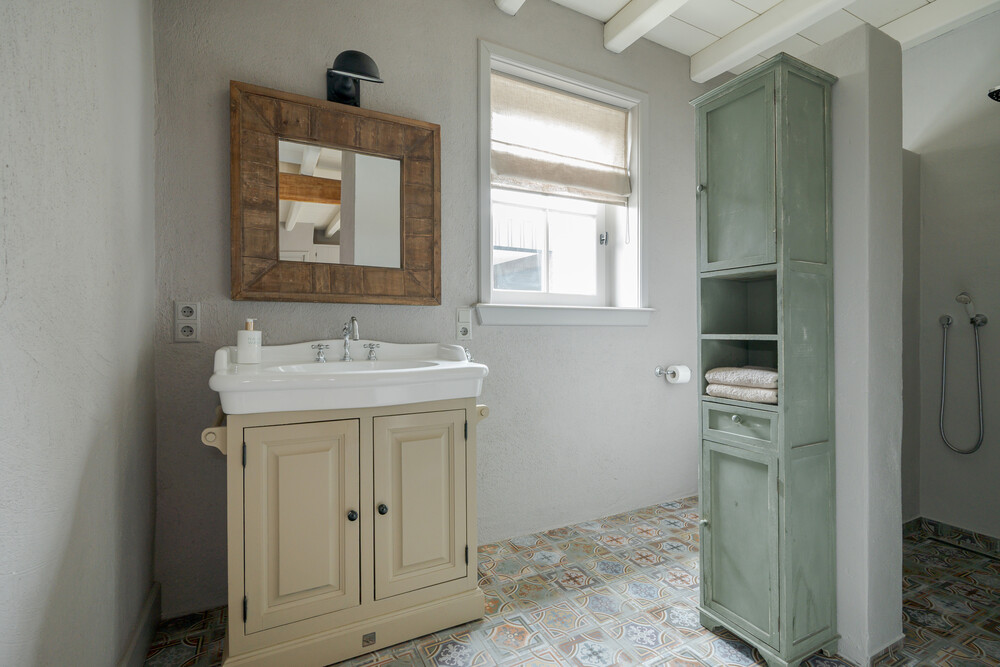 Badkamer, sfeervol ingericht met betegeling op de vloer en (vochtwerend) stucwerk op de wanden. In de badkamer treft u een wandcloset met inbouwreservoir, een ruime inloopdouche met hand- en regendouche en een wastafel in een wastafelmeubel.De begane grond is deels uitgevoerd met plavuizen, deels met een parketvloer.