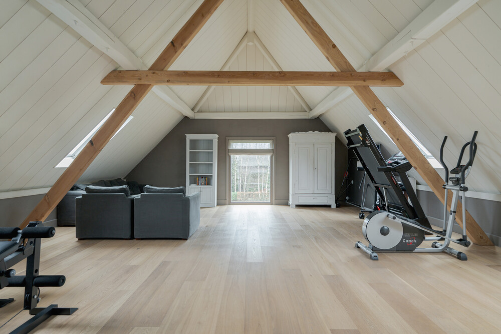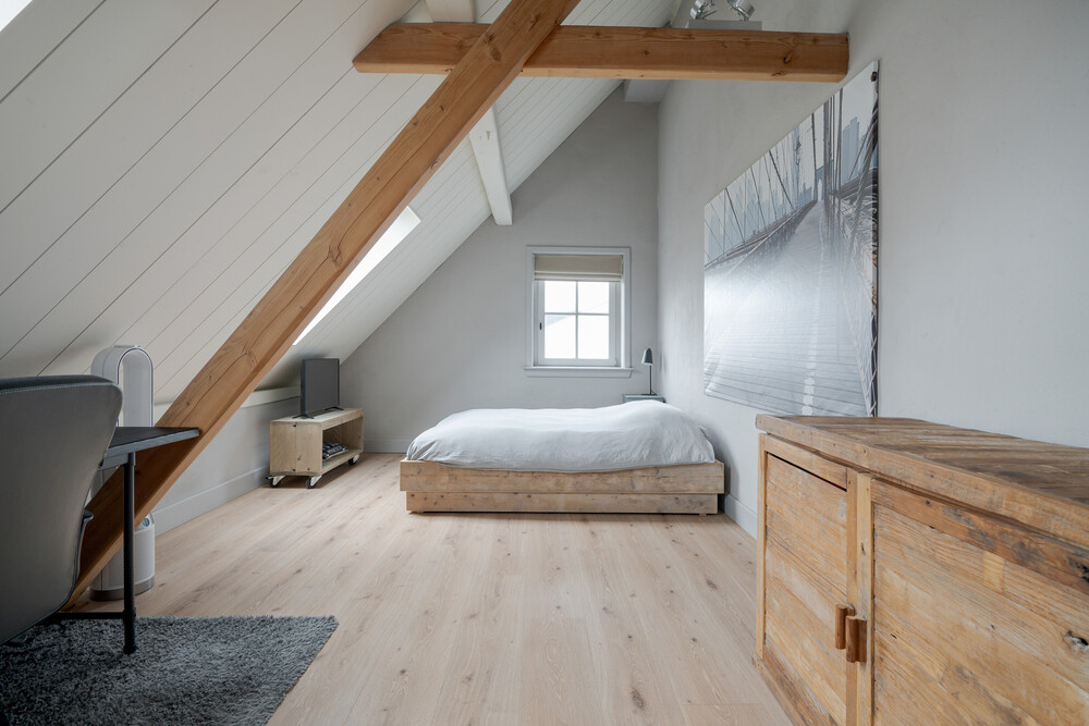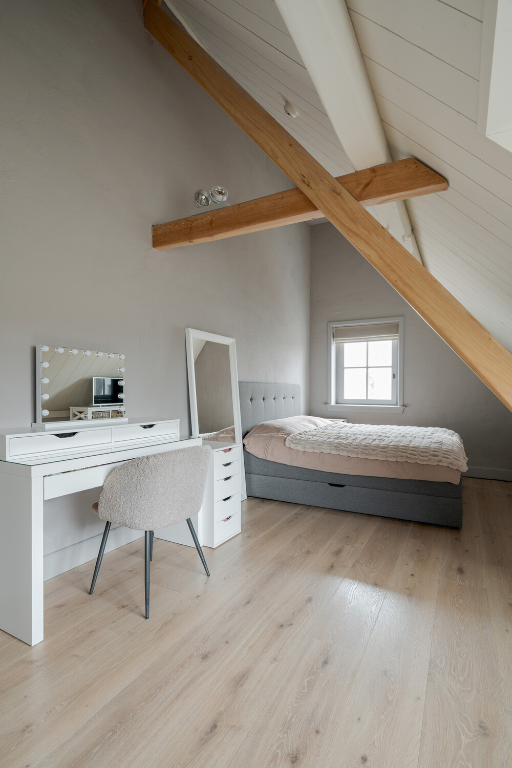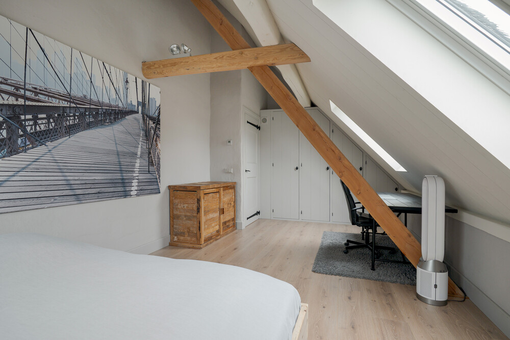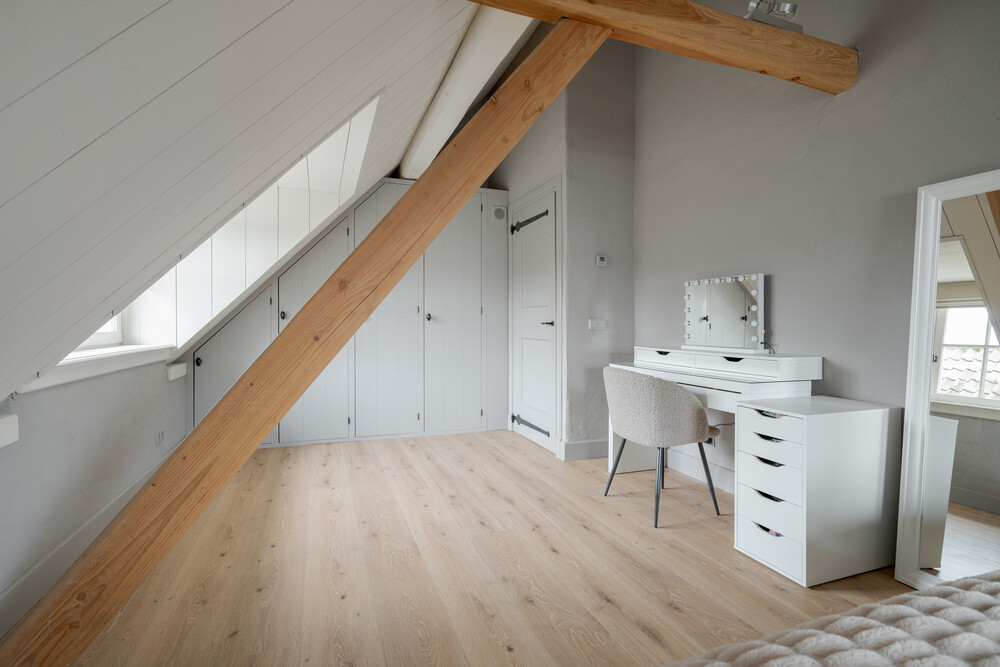 Riante zolderruimte over de gehele breedte van de woning. Deze ruimte is te gebruiken als hobby- of werkkamer, maar uiteraard ook als slaapkamer. Het formaat van deze ruimte (met Velux-dakvensters) maakt het mogelijk om hier meerdere extra kamers te creëren.De overloop en zolderkamer zijn voorzien van een parketvloer; de slaapkamers zijn voorzien van laminaat dat niet van parket te onderscheiden is.