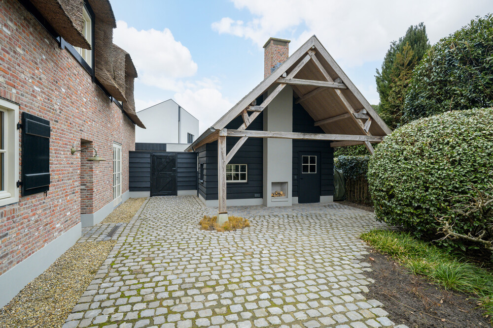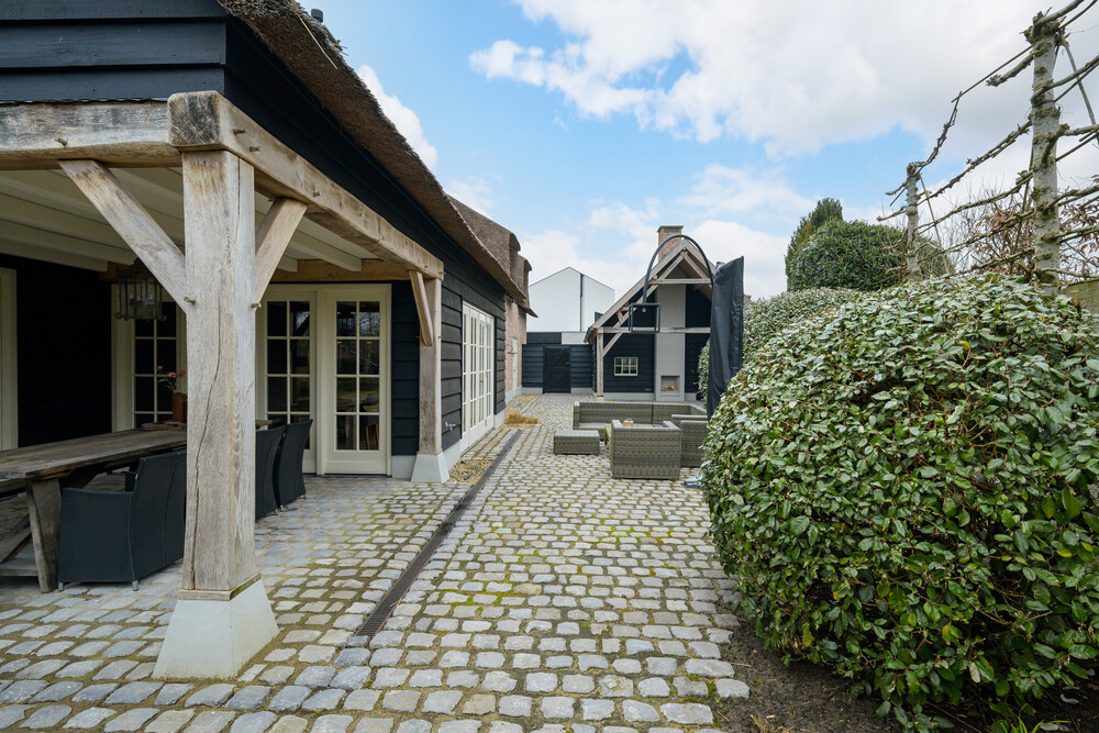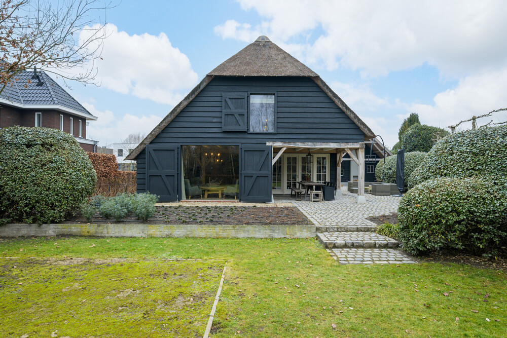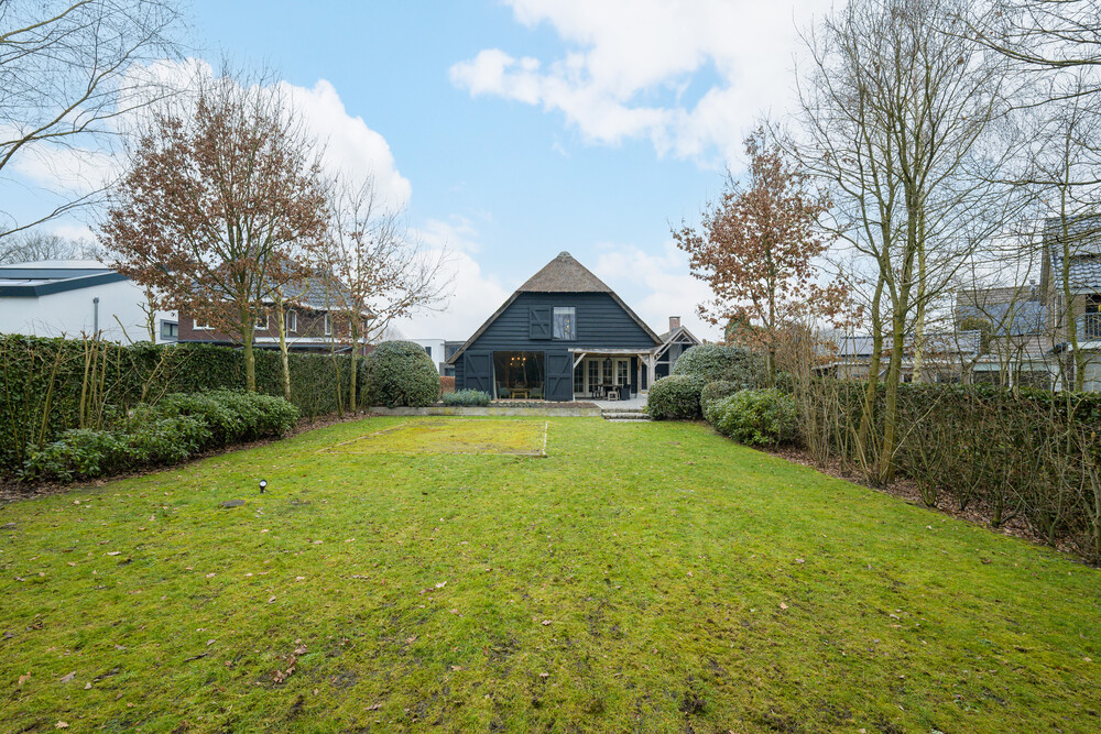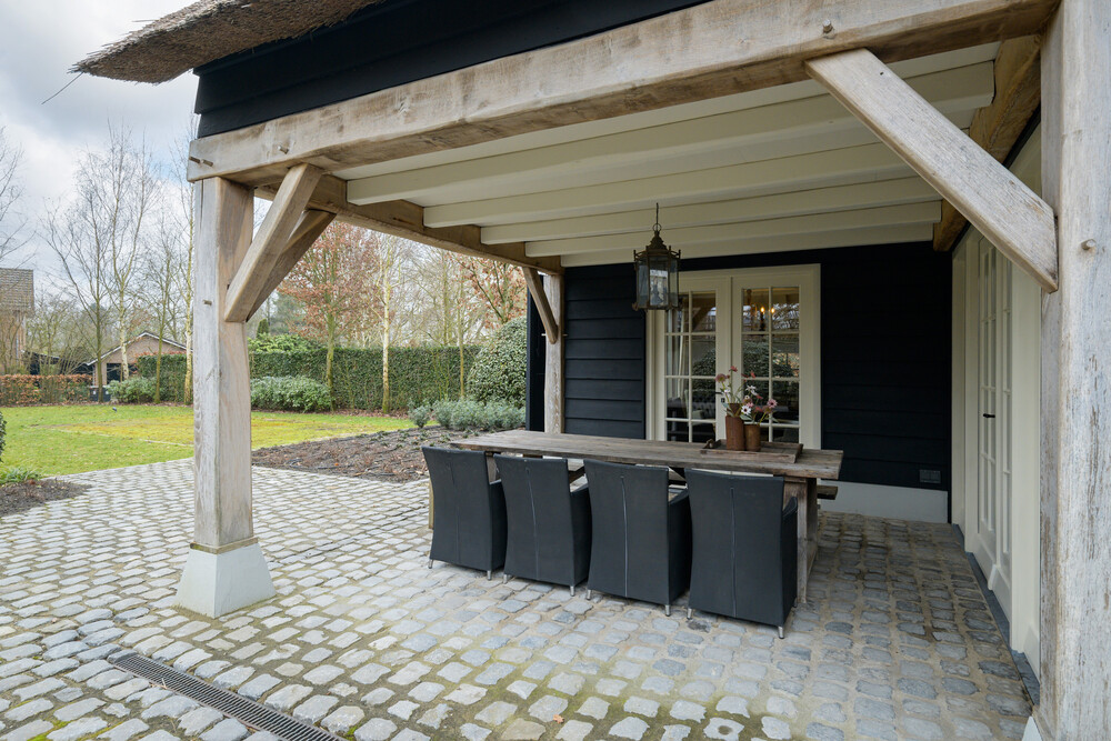 De tuin is rondom de woning gelegen en fraai aangelegd. Er zijn meerdere terrassen (in kinderkopjes uitgevoerd), waarvan twee overkapt. Bij het terras aan de zijkant is een open haard aanwezig. Daarnaast treft u o.a. een groot gazon en borders met zeer variërende beplanting, bomen en heesters. De paden zijn deels in siergrind uitgevoerd. De tuin is voorzien van tuinverlichting en beregening.Bijgebouw