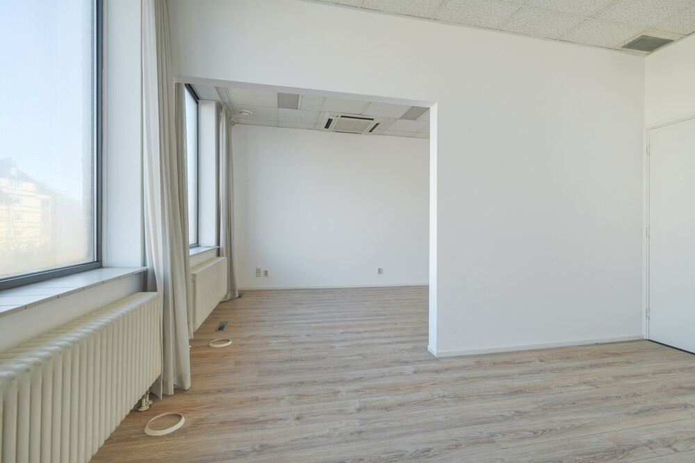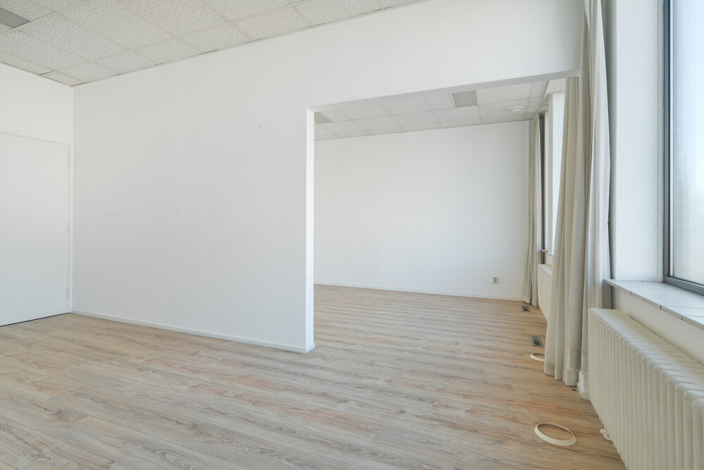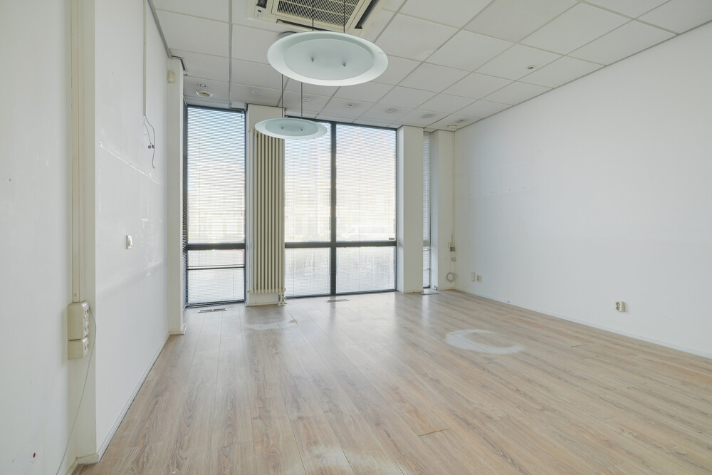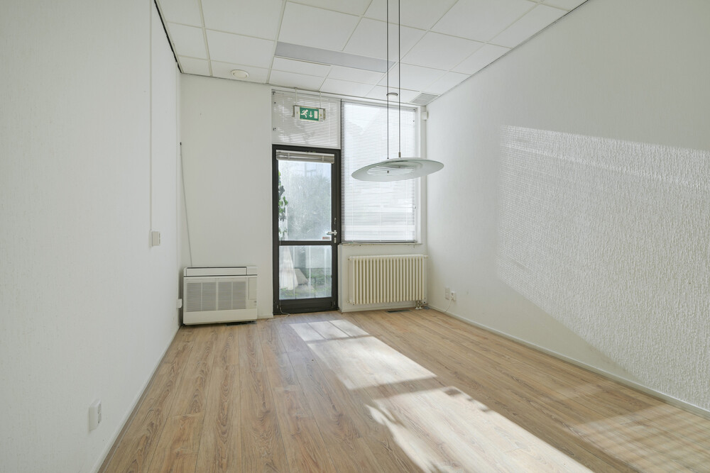 De woonkamer op de begane grond biedt de mogelijkheid om te worden samengevoegd tot één royale, open leefruimte, die geheel naar eigen wens kan worden ingericht met bijvoorbeeld een keuken, atelier of kantoorruimte.