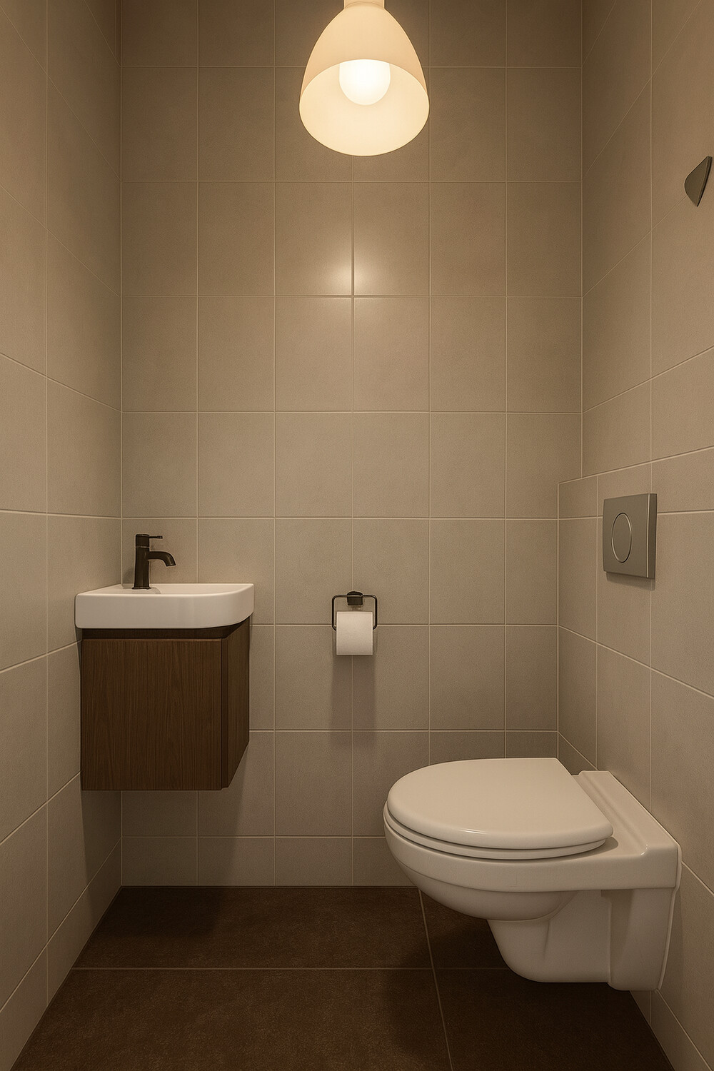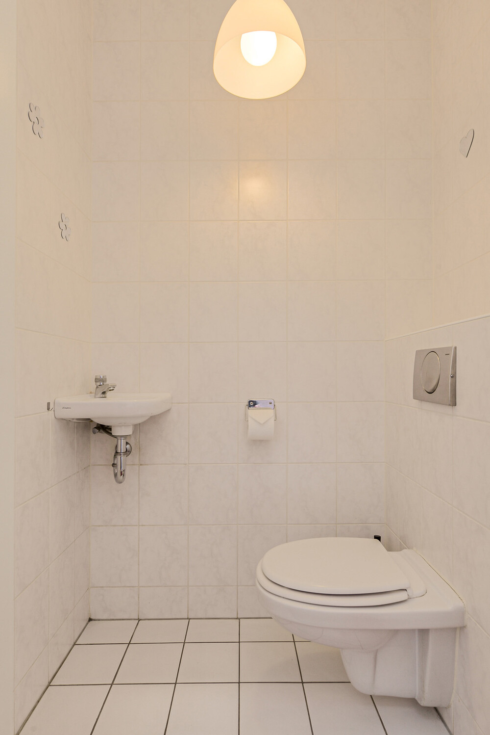 Toiletruimte met wand closet met inbouwreservoir en fonteintje.Badkamer