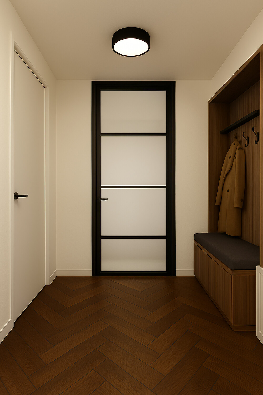 Hal met toegang tot het appartement:Entree met meterkast (8 groepen met aardlekschakelaars), toegang tot de diverse vertrekken: