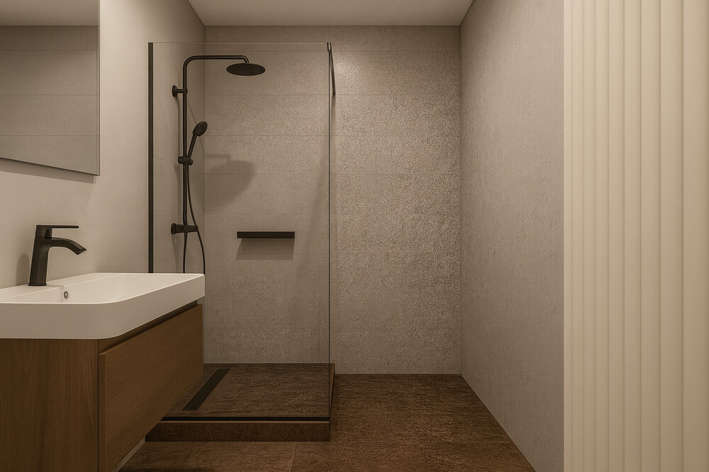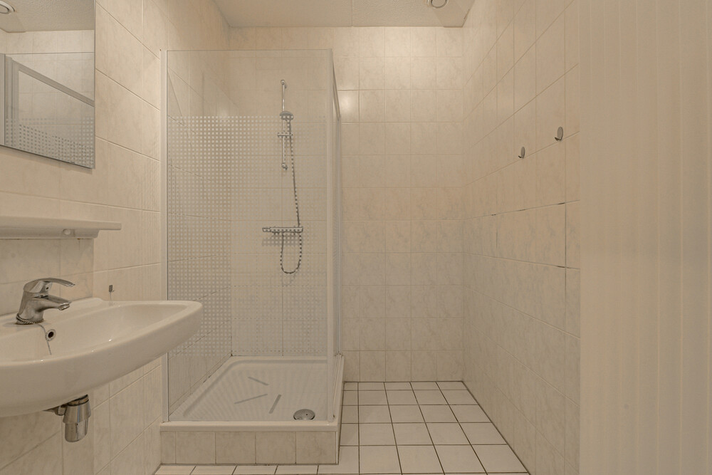 Badkamer met douchecabine met thermostaatkraan, wastafel en designradiator.Slaapkamer ii