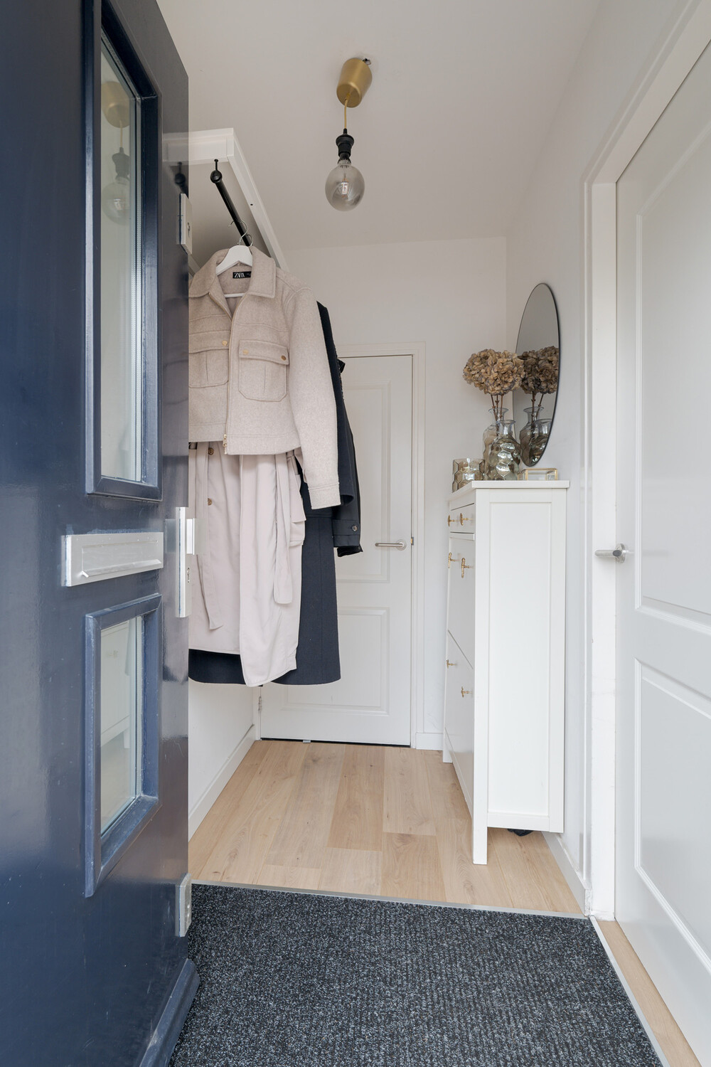 Hal/entree met vaste kast waarin de meterkast is gesitueerd en toegang tot de woonkamer.WOONKAMER/KEUKEN