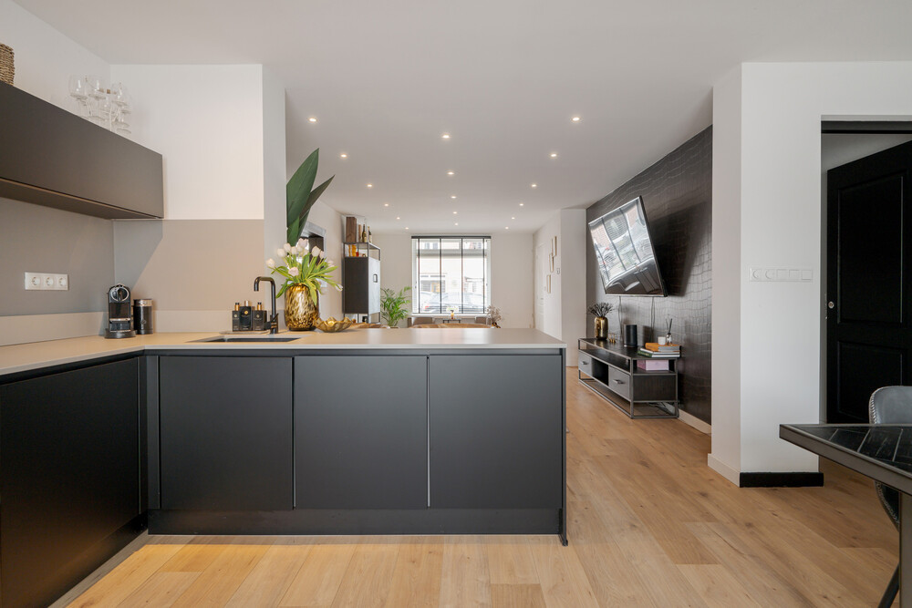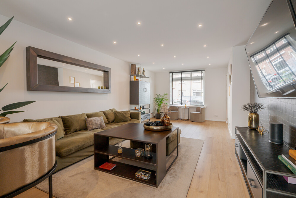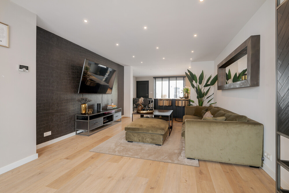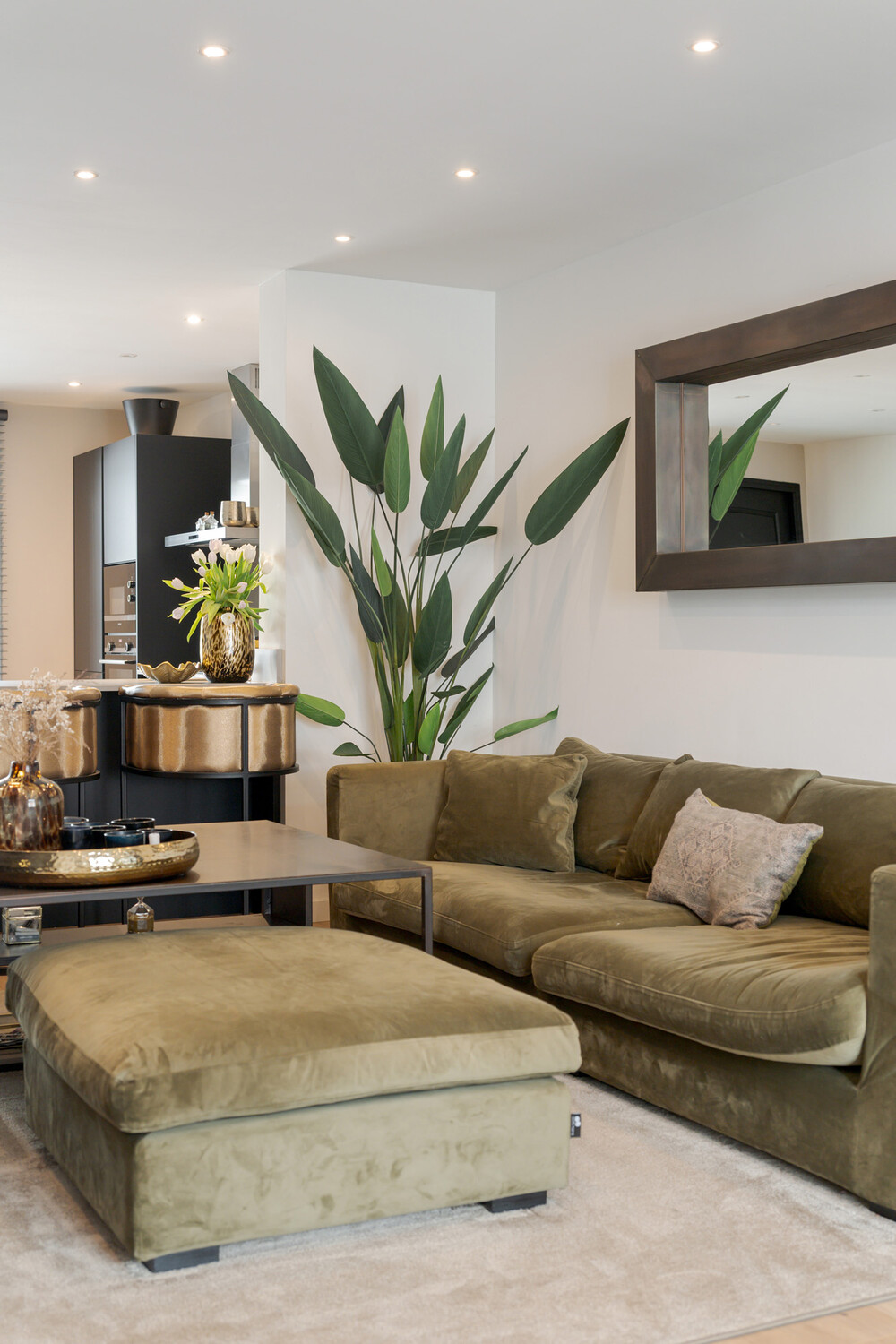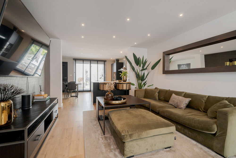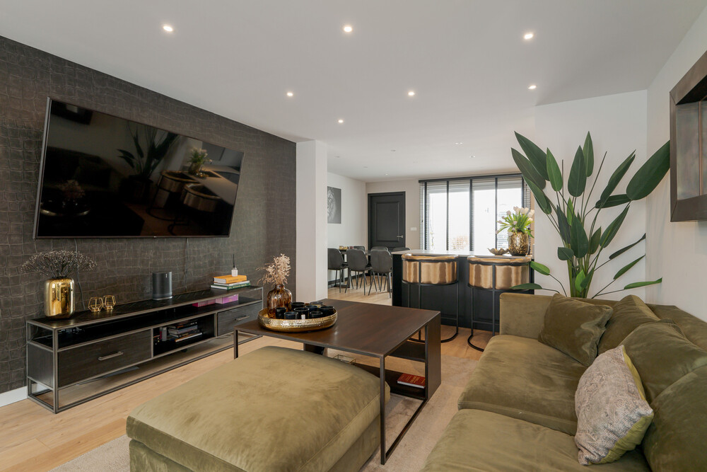 Ruime woonkamer met inbouwplafondspots en open leefkeuken.
