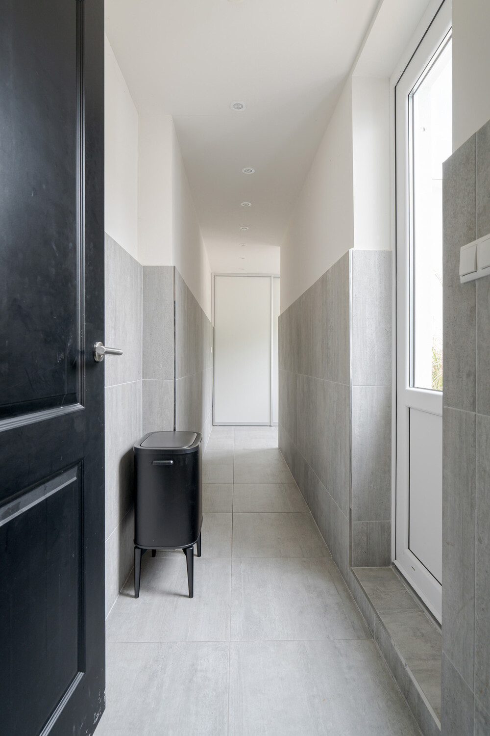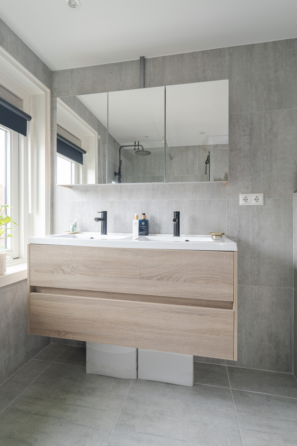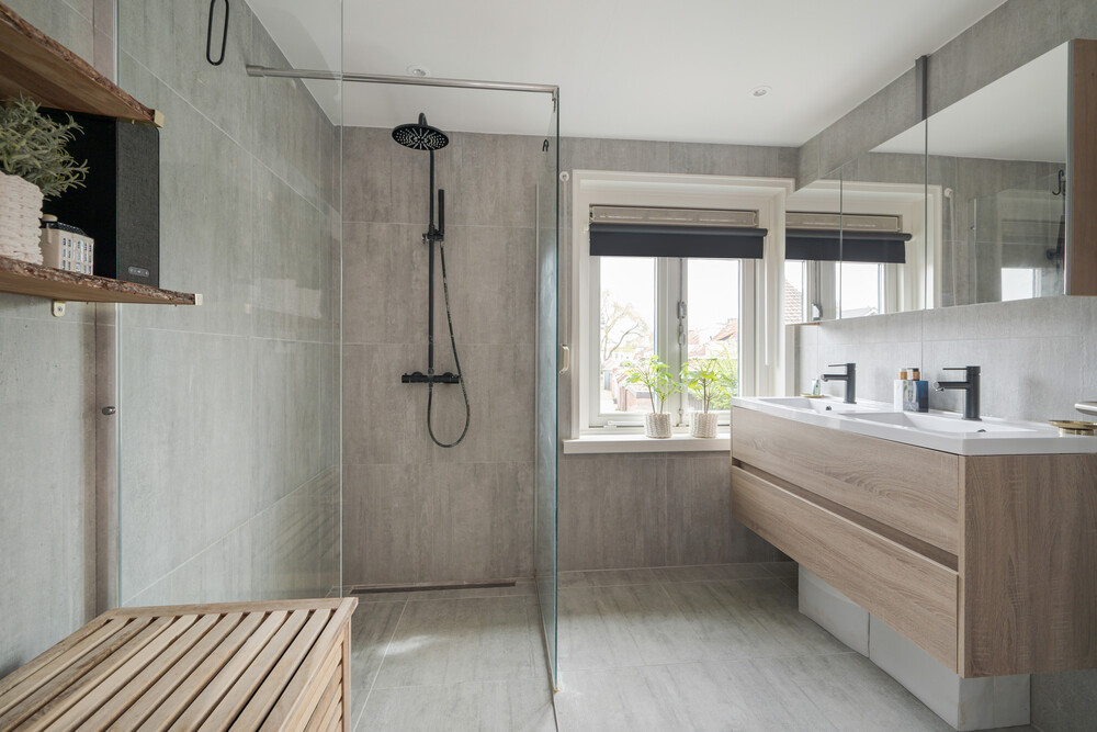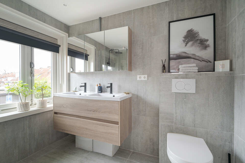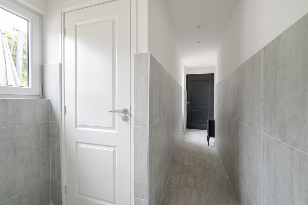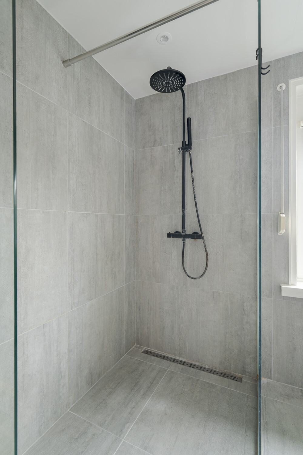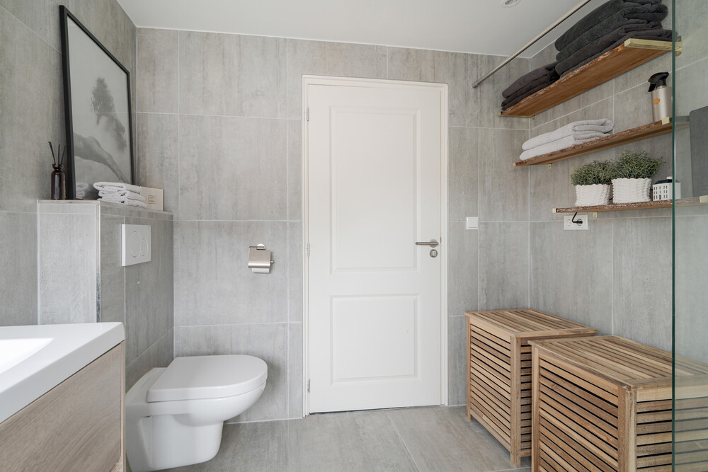 Gelegen aan de voorzijde en voorzien van een inloopdouche met regen- en handdouche met draingoot, dubbele wastafel in meubel en zwevend wandcloset met inbouwreservoir en mechanische ventilatie.