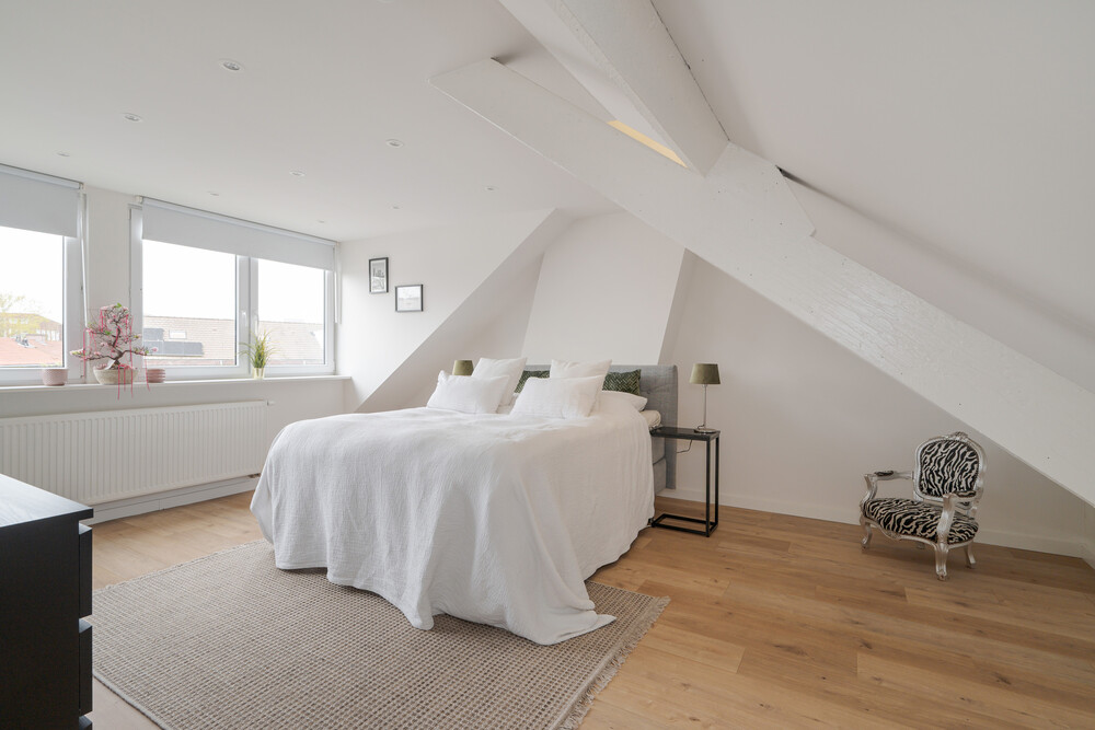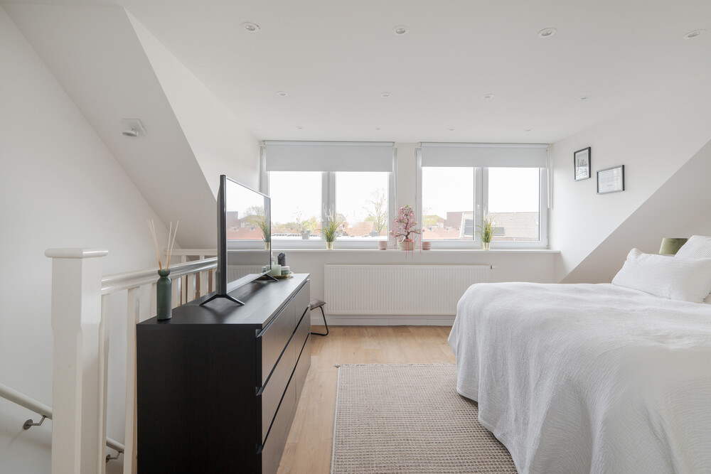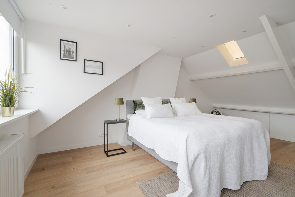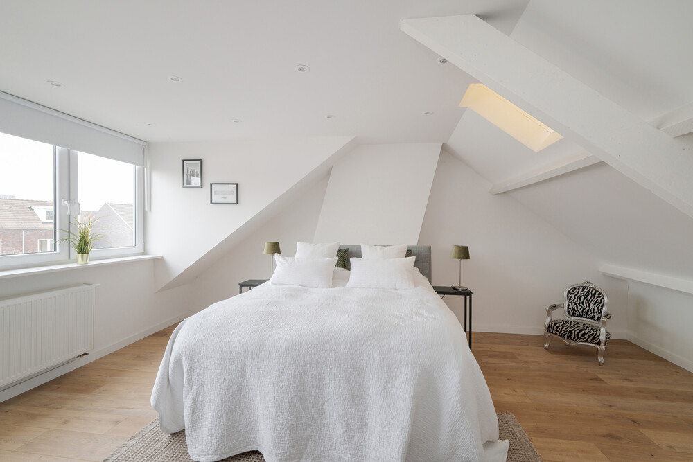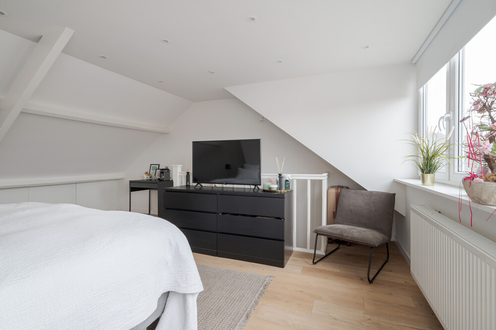 Deze slaapkamer is voorzien van een dakkapel en praktische bergruimte achter de knieschotten.Tuin