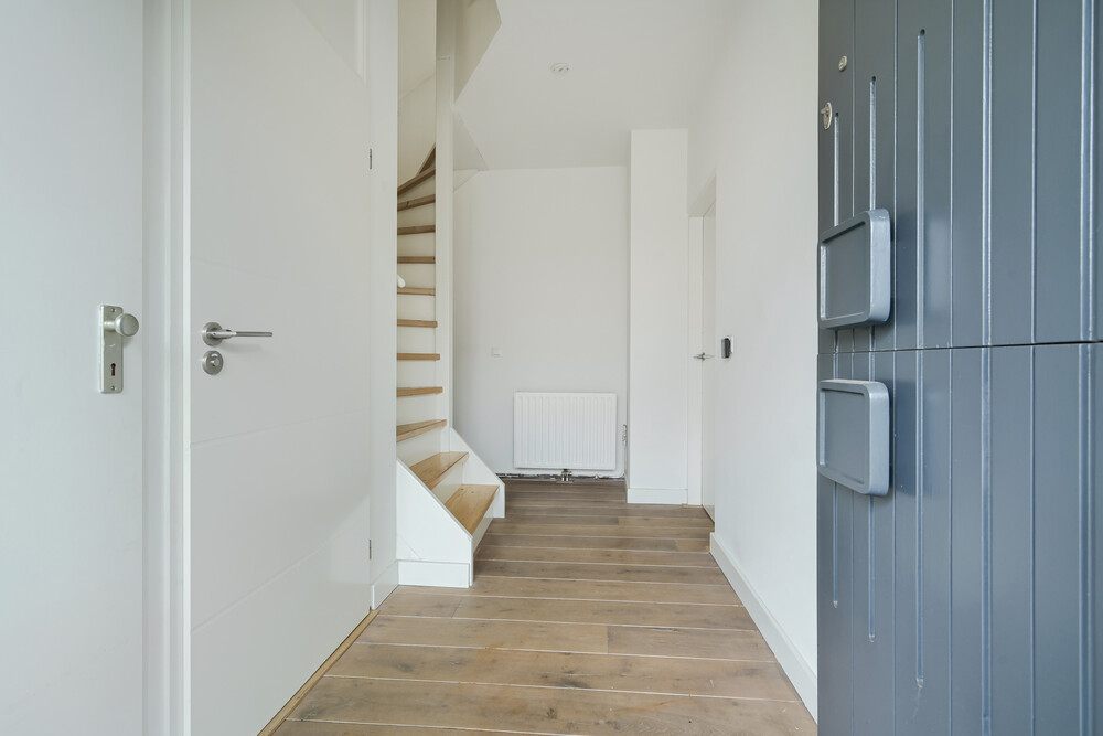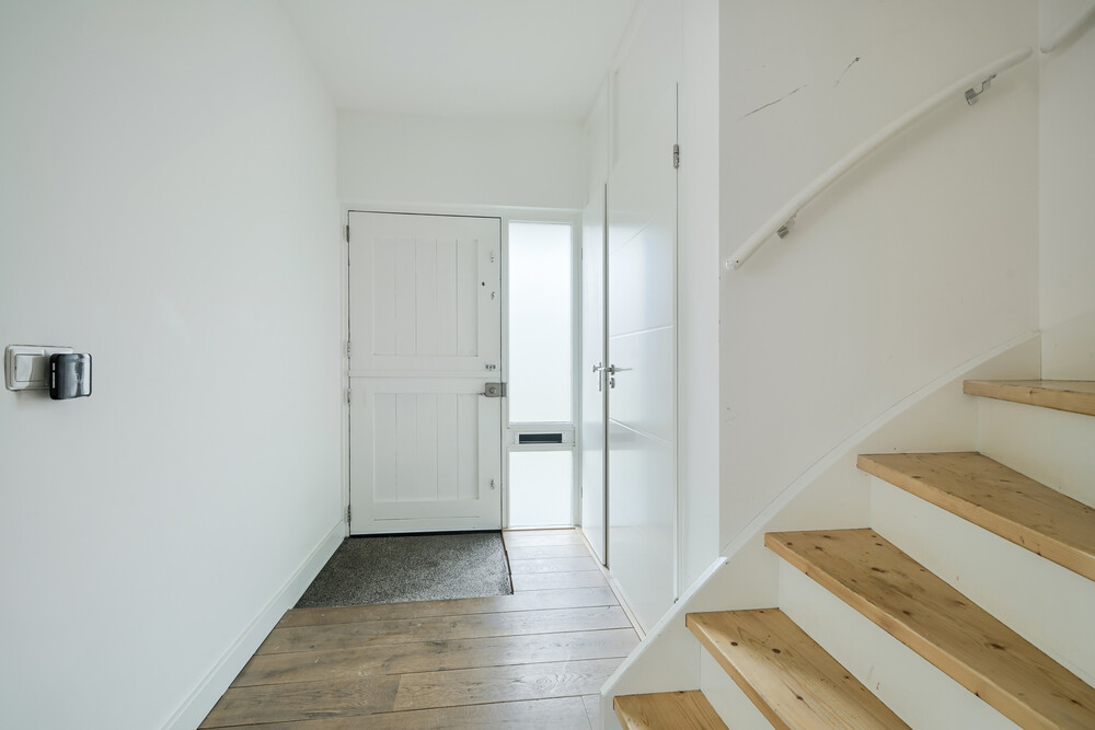 De hal is voorzien van een eikenhouten vloer, garderobehoek, meterkast (vernieuwd met 8 groepen en 3 aardlekschakelaars) en een gerenoveerde trapopgang naar eerste verdieping.Toilet