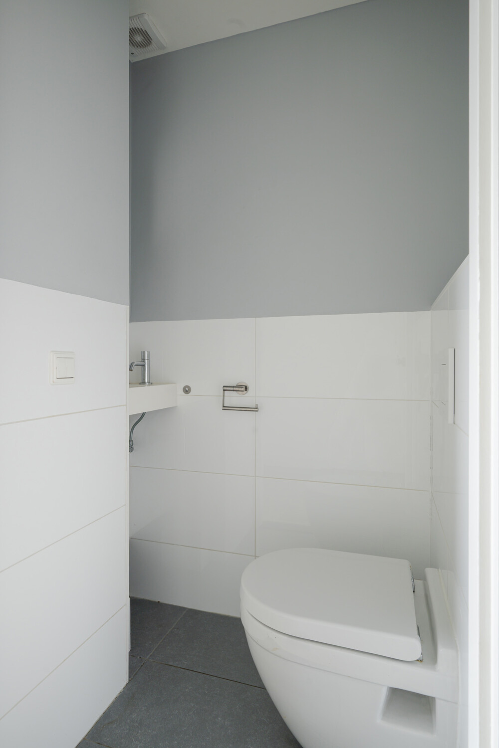 Moderne toiletruimte met wandcloset, inbouwreservoir, fonteintje en mechanische ventilatie.Woonkamer