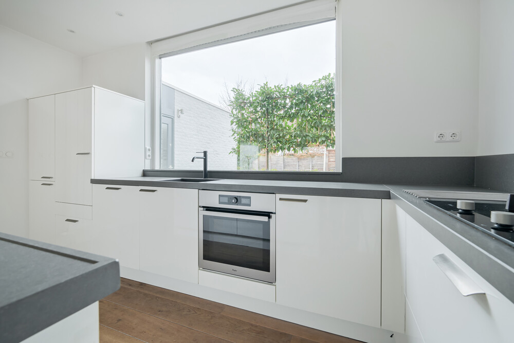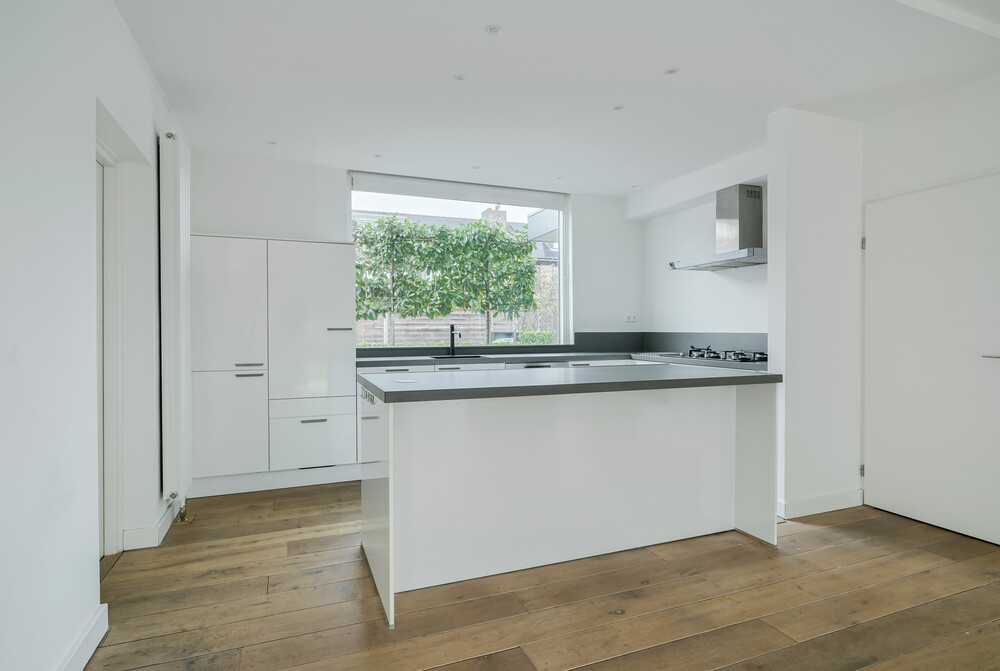 Open keuken aan de voorzijde (ca. 4.00 x 4.20 m) met een moderne inrichting bestaande uit een aanrecht in hoekopstelling voorzien van een composiet blad met spoelbak, 5-pits gaskookplaat, afzuigkap, vaatwasmachine, elektrische oven, koelkast en diverse kasten en laden alsmede een groot werkeiland (ca. 0,90 x 2.05 m) met composiet blad en kastruimte. Voorts is de keuken voorzien van een designradiator en inbouwverlichting. Vanuit de keuken toegang tot de bijkeuken.Bijkeuken