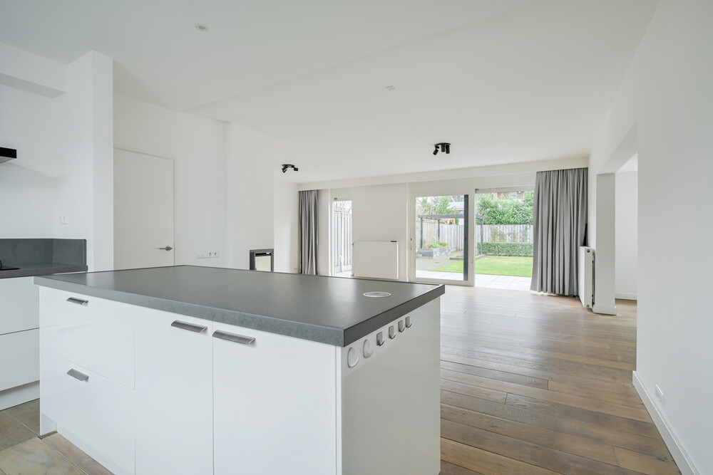 Ruime en speels ingedeelde op de tuin gerichte woonkamer (ca. 4.60 x 6.80 m) in open verbinding met de keuken en de eet-/werkkamer (totaal ca. 63m2). De woonkamer is voorzien van een eikenhouten vloer, gashaard en een schuifpui naar de tuin.Eet-/werkkamer