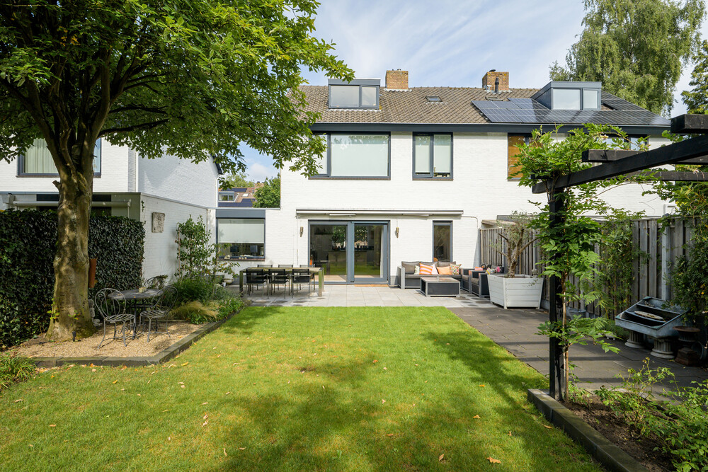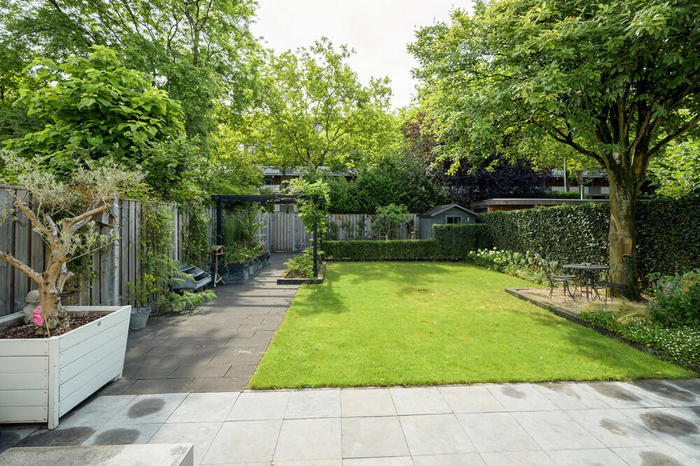De royale en fraai aangelegde achtertuin heeft een diepte van ca. 18.00m diepe en breedte van ca. 10.00m. Deze tuin is gesitueerd op het zuidoosten en is voorzien van diverse terrassen, waarbij het terras tegen de woning is voorzien van een groot zonnescherm. In de tuin bevinden zich fraaie plantenborders, een pergola en een groot gazon en een vrijstaande houten tuinberging. Via een poort is de achtergelegen openbare weg bereikbaar.