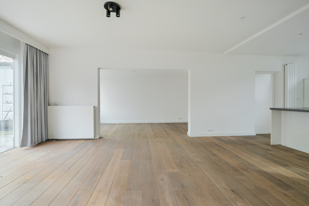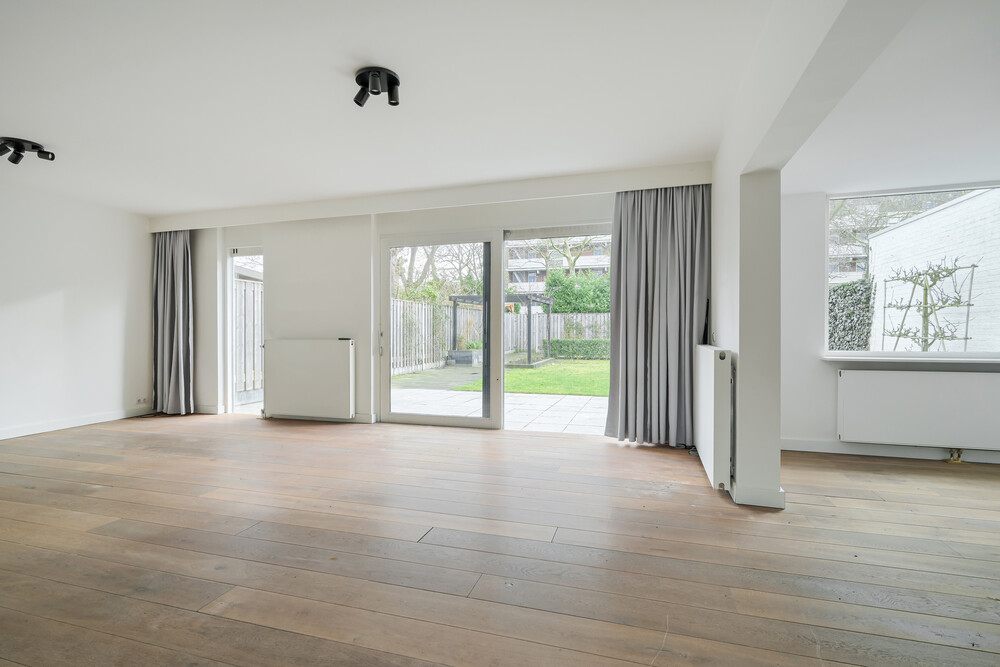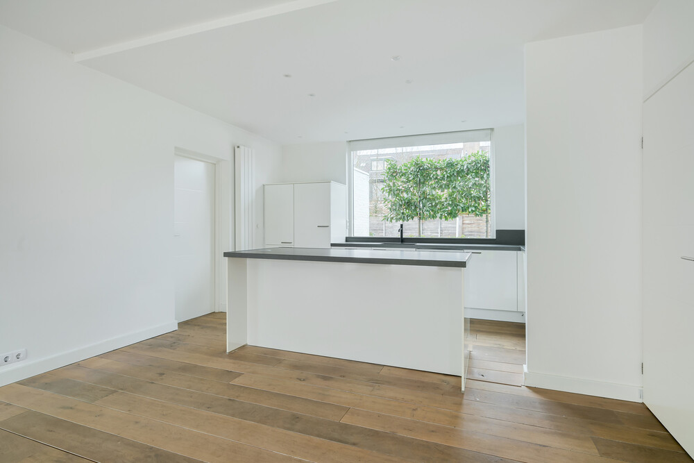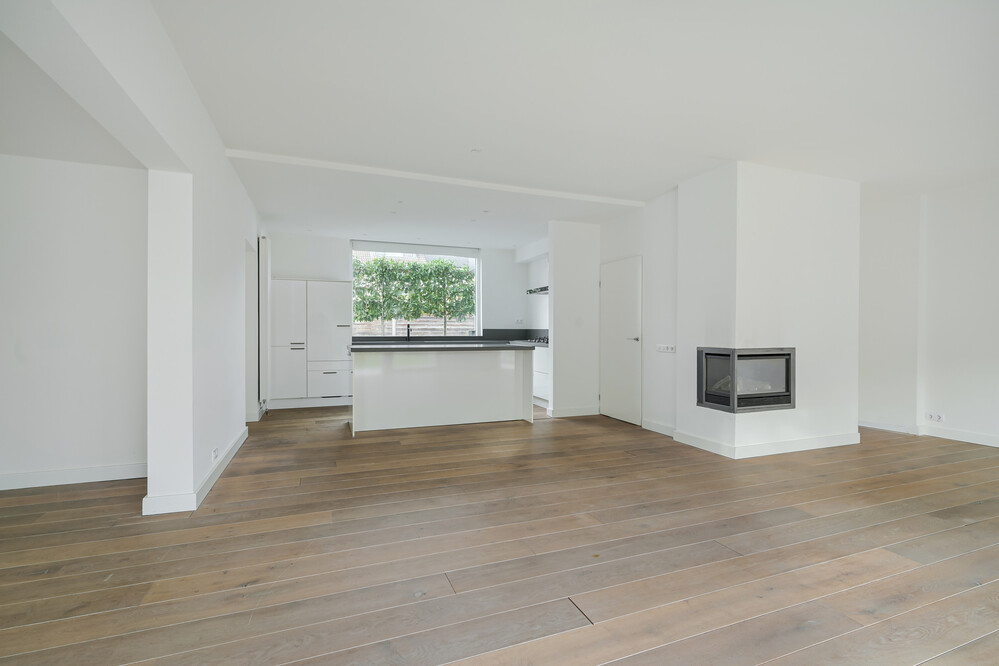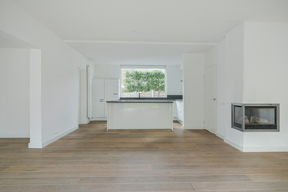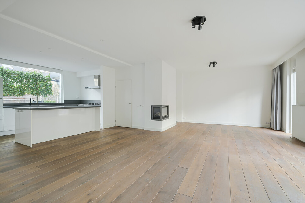 Ruime en speels ingedeelde op de tuin gerichte woonkamer (ca. 4.60 x 6.80 m) in open verbinding met de keuken en de eet-/werkkamer (totaal ca. 63m2). De woonkamer is voorzien van een eikenhouten vloer, gashaard en een schuifpui naar de tuin.Eet-/werkkamer