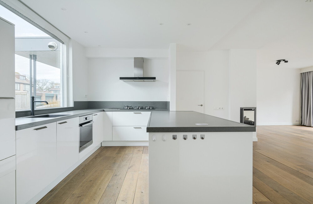 Open keuken aan de voorzijde (ca. 4.00 x 4.20 m) met een moderne inrichting bestaande uit een aanrecht in hoekopstelling voorzien van een composiet blad met spoelbak, 5-pits gaskookplaat, afzuigkap, vaatwasmachine, elektrische oven, koelkast en diverse kasten en laden alsmede een groot werkeiland (ca. 0,90 x 2.05 m) met composiet blad en kastruimte. Voorts is de keuken voorzien van een designradiator en inbouwverlichting. Vanuit de keuken toegang tot de bijkeuken.Bijkeuken