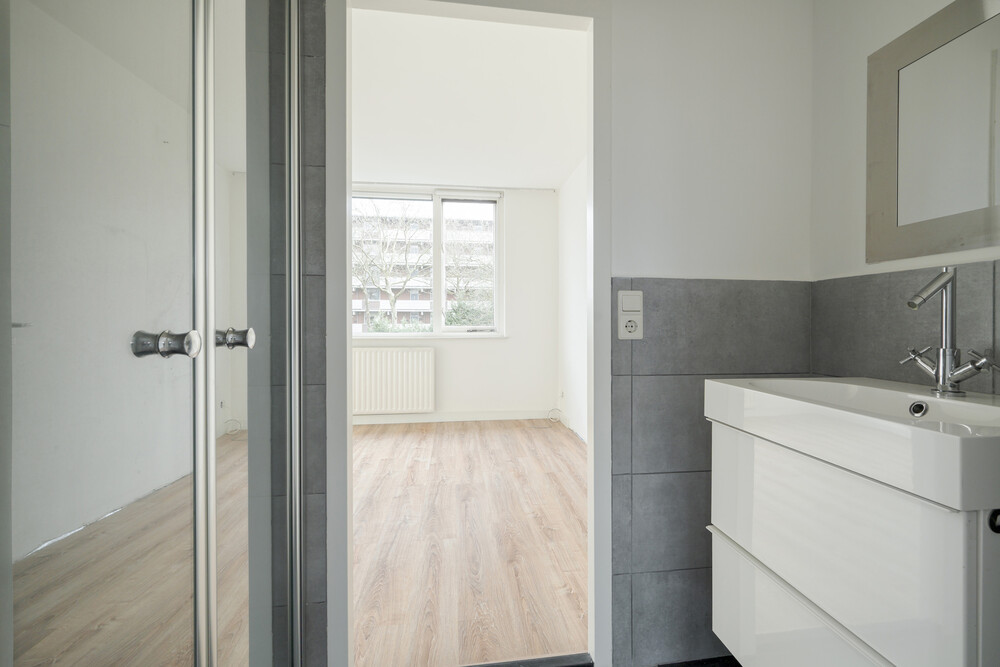 Slaapkamer (ca. 3.35 x 3.85 m) gelegen aan de voorzijde van de woning en voorzien van een laminaatvloer en deur naar 2e badkamer.Badkamer i