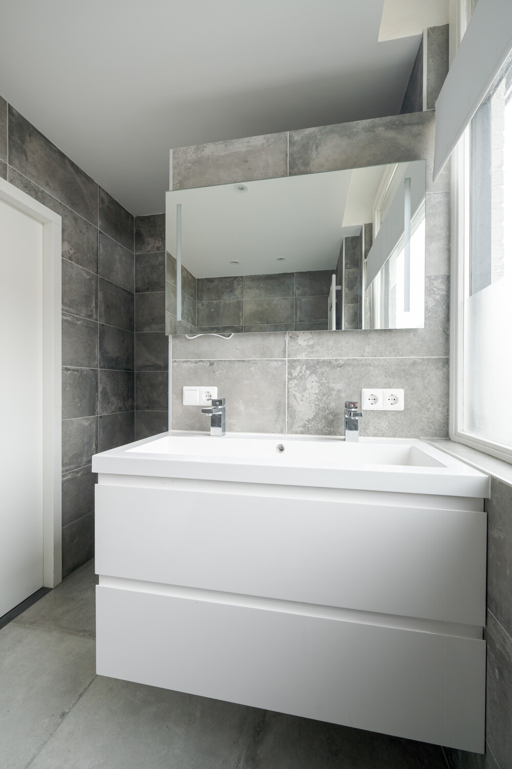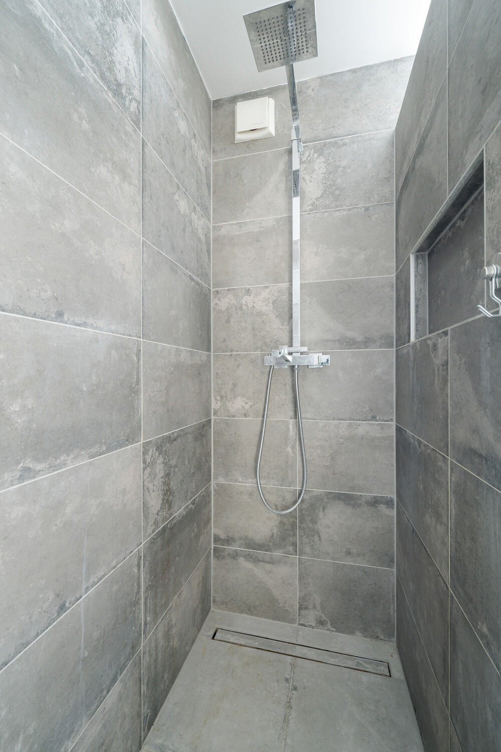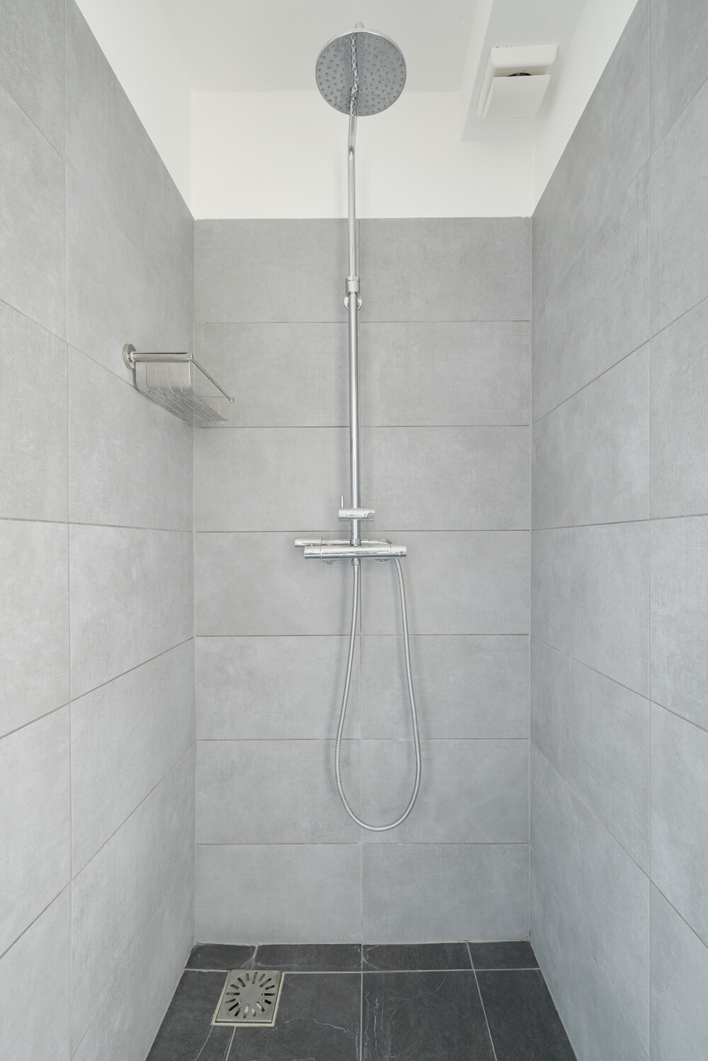 Kleinere badkamer (ca. 1.00 x 2.50 m) voorzien van een inloopdouche met thermostaatkraan en hardglazen deur en een wastafelmeubel met laden en een spiegel.