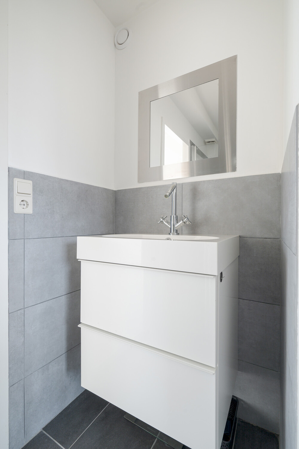Moderne toiletruimte met wandcloset, inbouwreservoir, fonteintje en mechanische ventilatie.Woonkamer