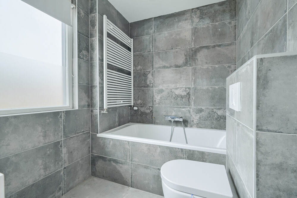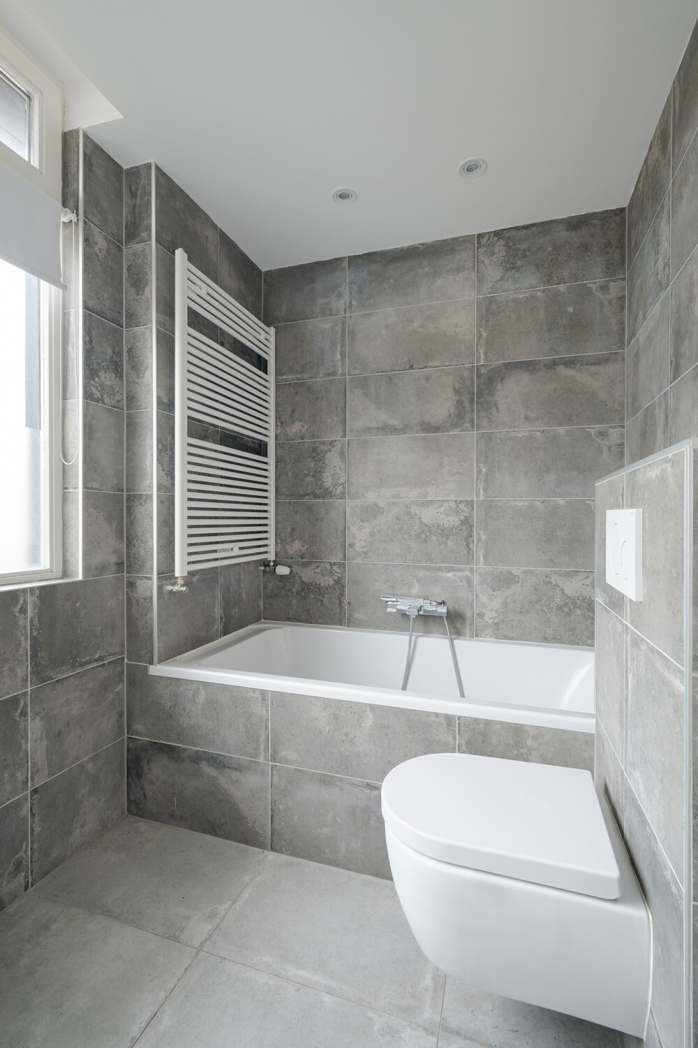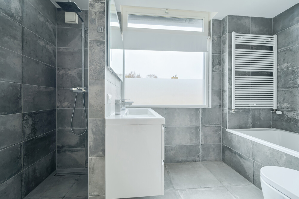 Grote badkamer (ca. 1.80 x 3.35 m) voorzien van een ligbad met thermostaatkraan, een inloopdouche met thermostaatkraan, regendouche en handdouche, een badkamermeubel met een brede wastafel, 2 kranen, laden en een spiegel, voorts een wandcloset met inbouwreservoir, een handdoekradiator en inbouwspots.Badkamer ii