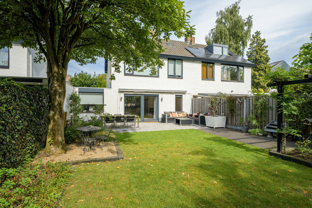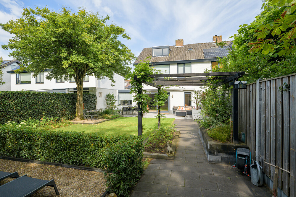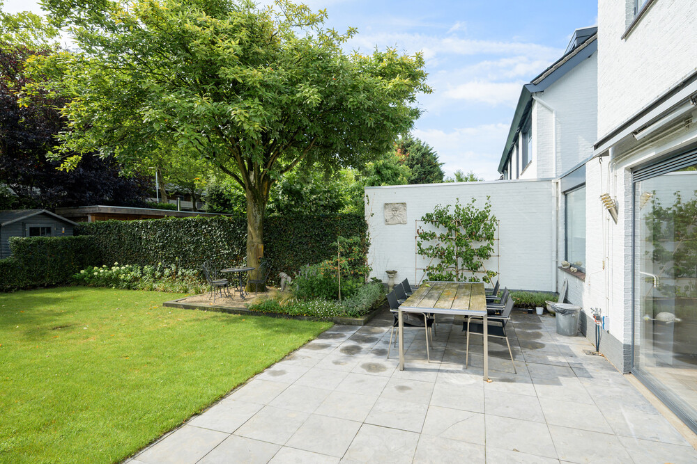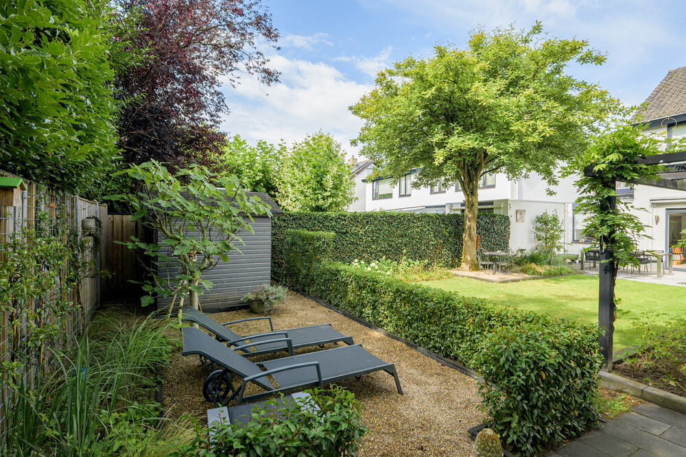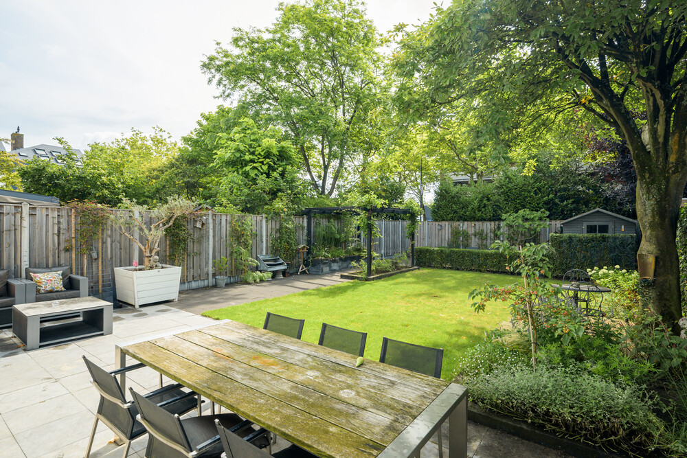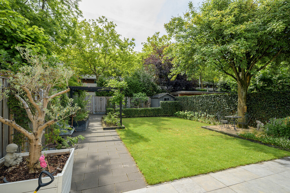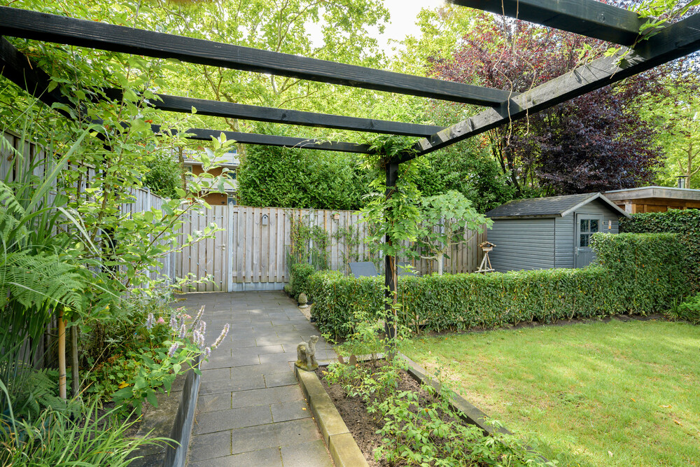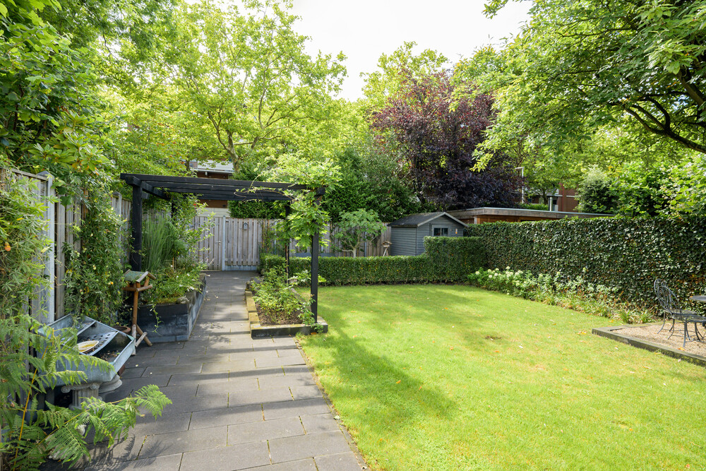 De royale en fraai aangelegde achtertuin heeft een diepte van ca. 18.00m diepe en breedte van ca. 10.00m. Deze tuin is gesitueerd op het zuidoosten en is voorzien van diverse terrassen, waarbij het terras tegen de woning is voorzien van een groot zonnescherm. In de tuin bevinden zich fraaie plantenborders, een pergola en een groot gazon en een vrijstaande houten tuinberging. Via een poort is de achtergelegen openbare weg bereikbaar.