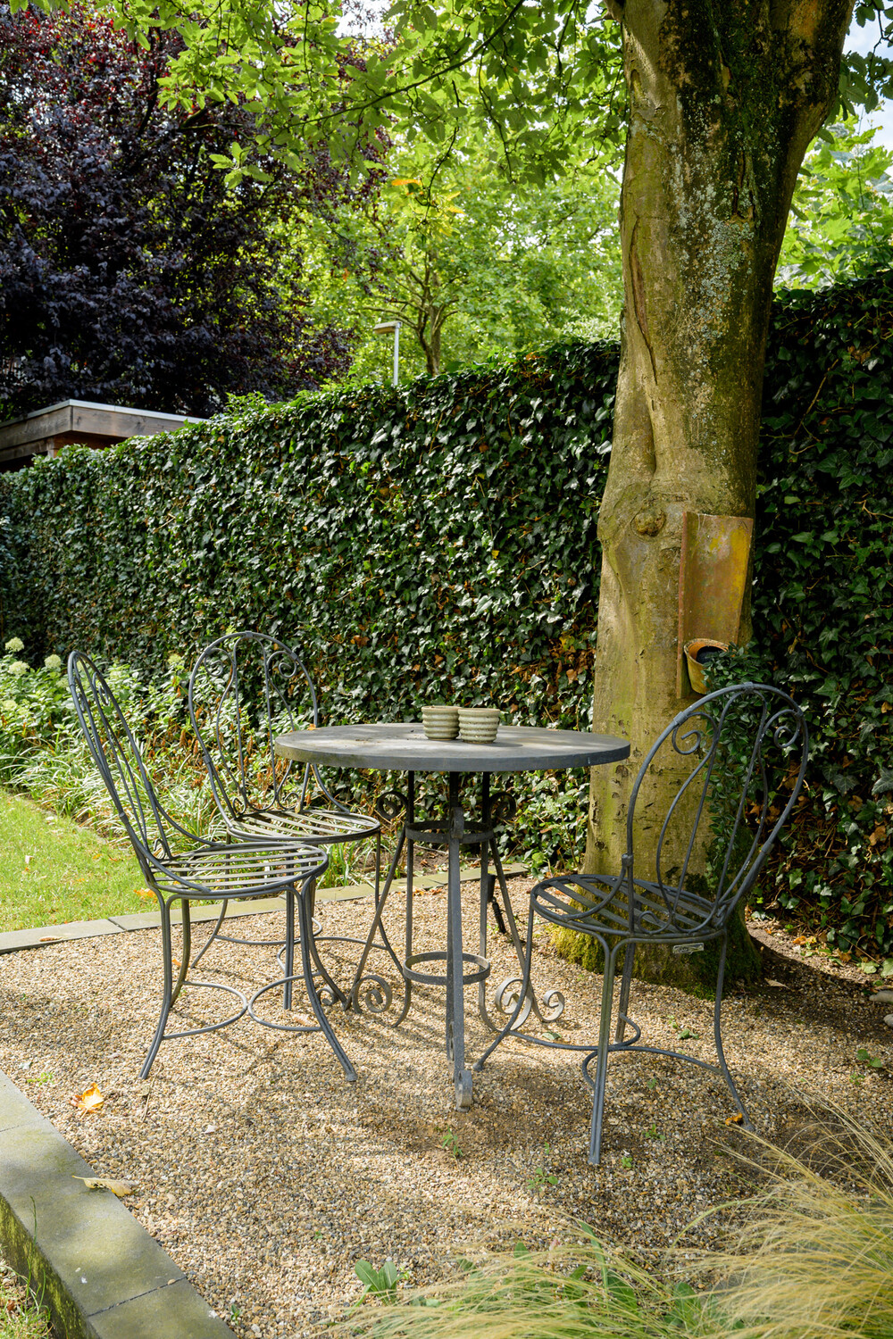 De grote en fraai aangelegde achtertuin is gesitueerd op het zuidoosten en vormt een verlengstuk van de woonruimte en biedt volop privacy, meerdere zitmogelijkheden en een ideale plek om in alle rust te genieten van het buitenleven.
