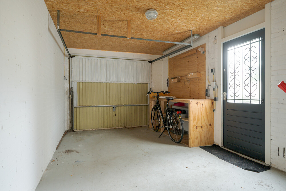 De garage (ca. 5.30 x 2.80/3.00 m) is voorzien van een stalen kanteldeur naar de oprit en een stapdeur naar de voortuin met parkeerplaatsen. De garage is voorzien van elektra en verwarming.Achtertuin