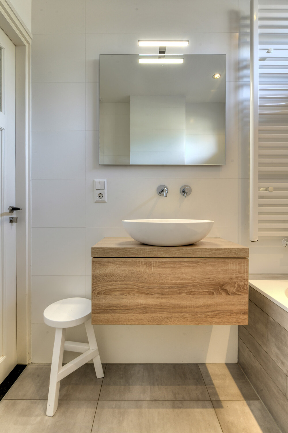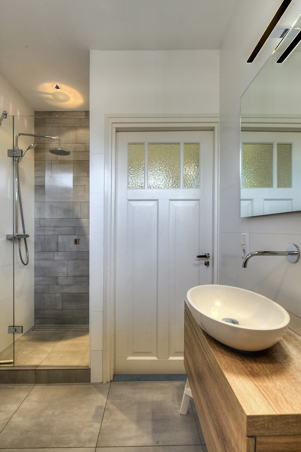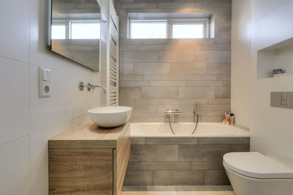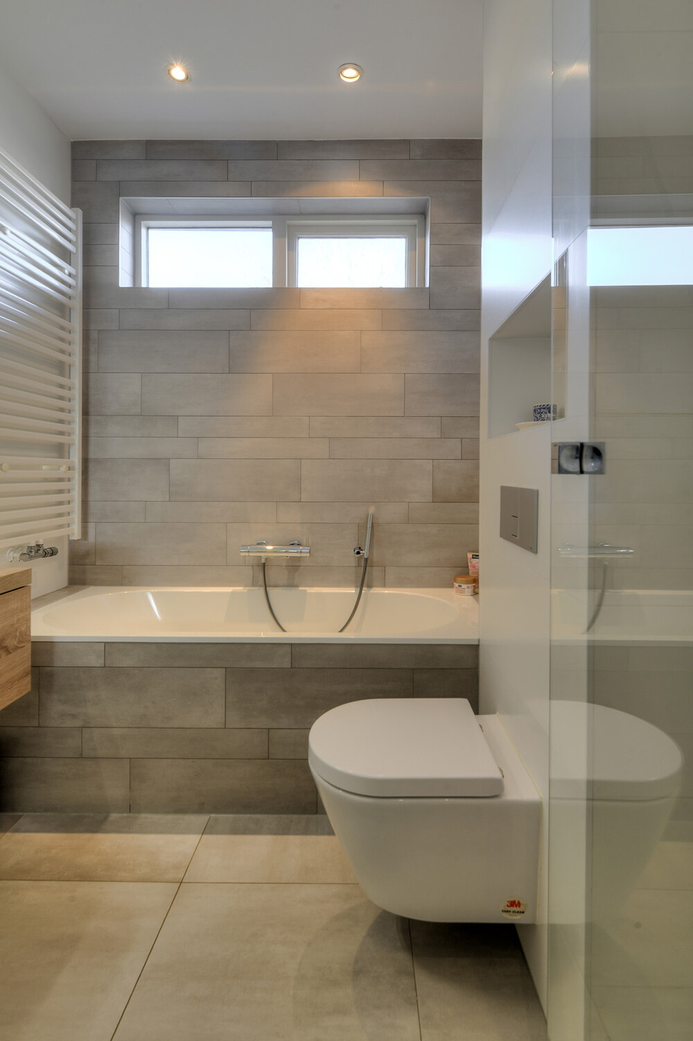 Moderne badkamer aan de achterzijde met ligbad voorzien van thermostaatkraan en douchegarnituur, separate inloopdouche voorzien van thermostaatkraan, regen- en handdouche en een hardglazen douchedeur; wandcloset met inbouwreservoir, wastafelmeubel met laden en spiegel met verlichting alsmede een handdoekradiator.
