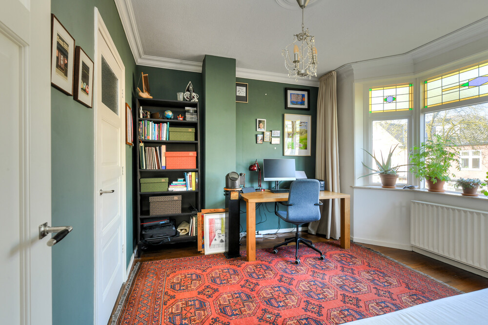 Slaapkamer aan de voorzijde met erker voorzien van glas-in-lood ramen, houten vloer en een muurkast.Badkamer
