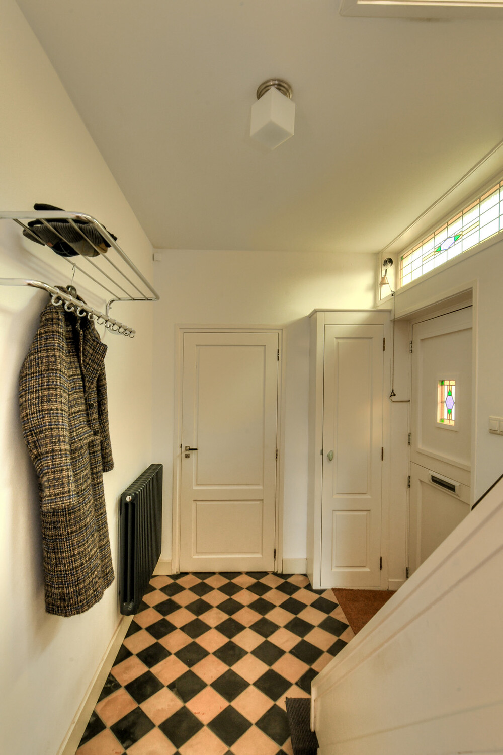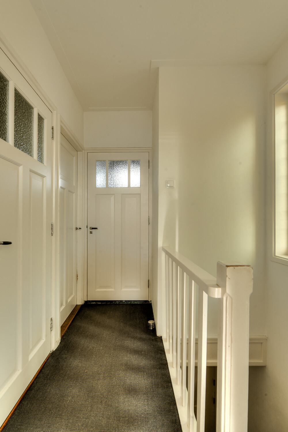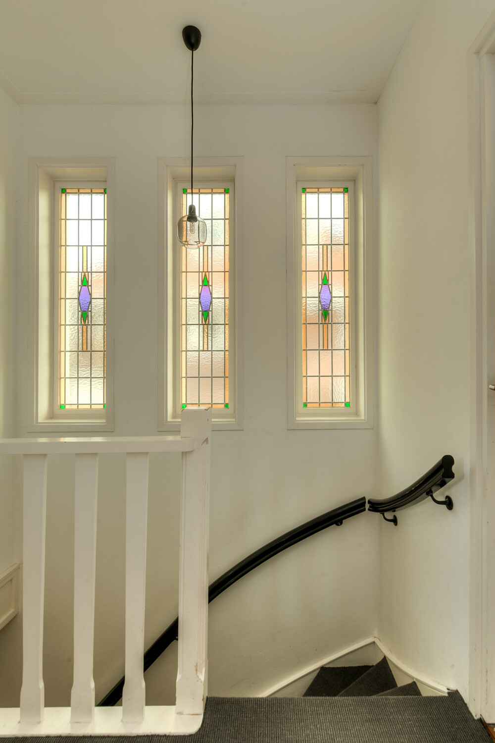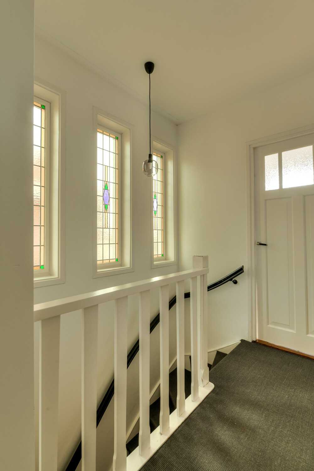 Via trap met fraaie glas-in-lood ramen toegang tot overloop met een afsluitbare trapopgang naar de tweede verdieping en toegang tot slaapkamers en badkamer.Slaapkamer i