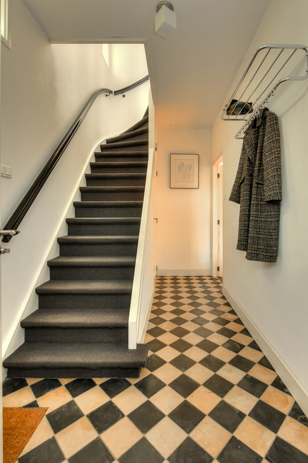 Entree in hal/gang met meterkast (7 groepen, kookgroep en aardlekschakelaar) met fraaie tegelvloer en trapopgang naar de eerste verdieping waaronder een verdiepte kelderkast.Toilet