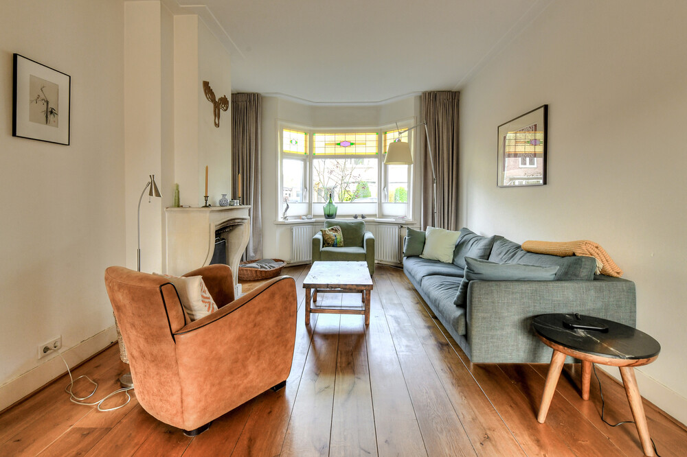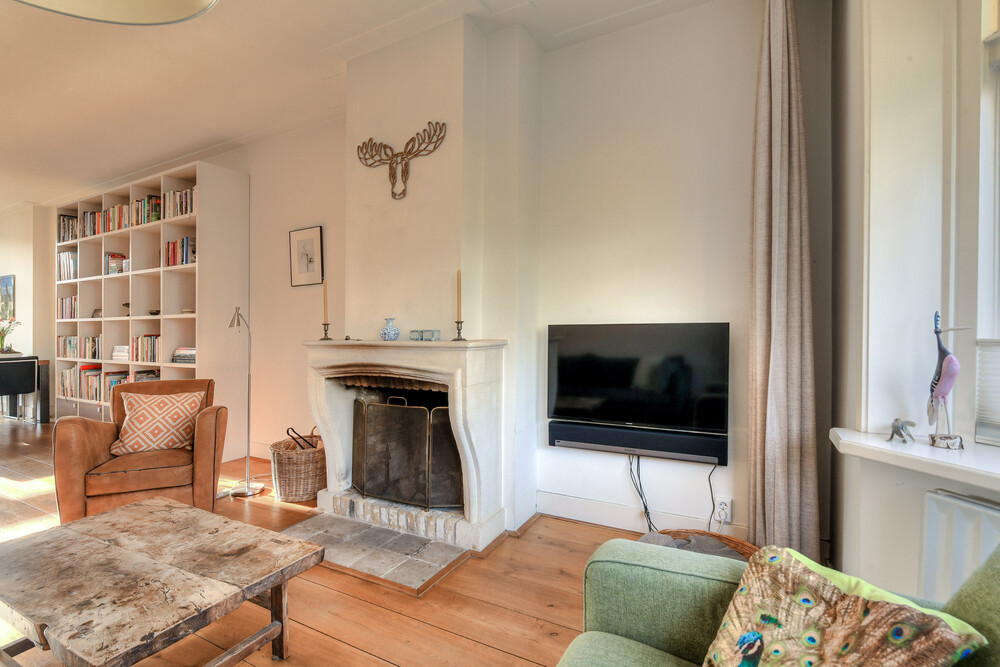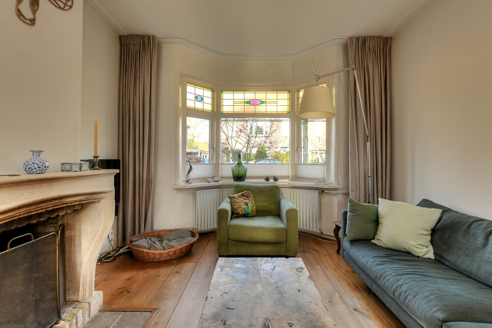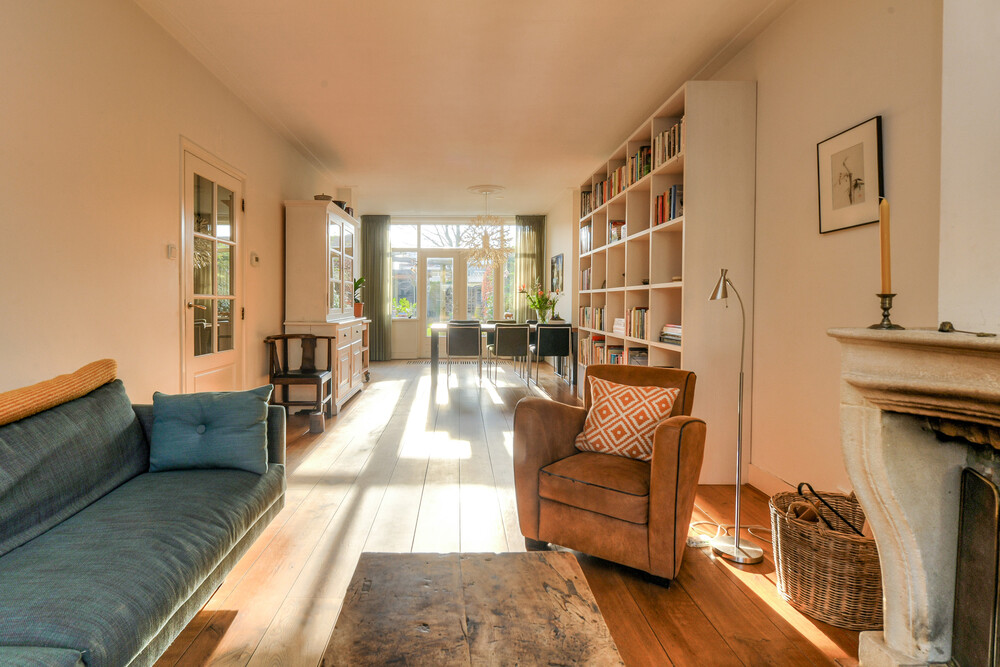 Ruime woonkamer met erker voorzien (geïsoleerde) glas-in-lood ruiten, houten vloer, zandstenen schouw met open haard, dubbele deuren naar de tuin en een open verbinding naar de werkhoek en keuken.Keuken