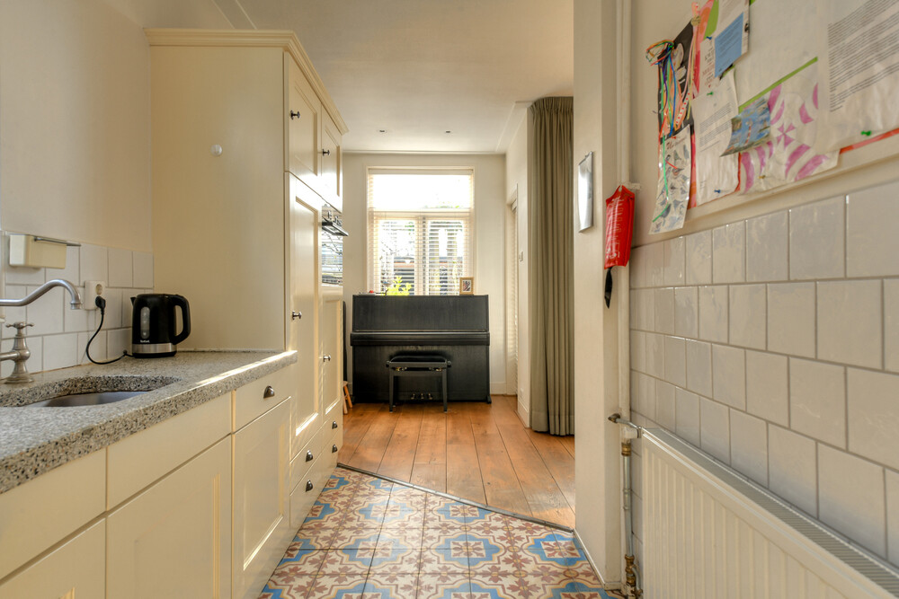 Semi-open keuken gelegen aan de achterzijde van de woning met zijraam en een keukeninrichting bestaande uit een aanrecht in hoekopstelling voorzien van een granito blad, spoelbak, 4-pits gaskookplaat, afzuigkap, combimagnetron, vaatwasmachine, koelkast en kastruimte. Vanuit de keuken een stapdeur naar de tuin.Werkhoek