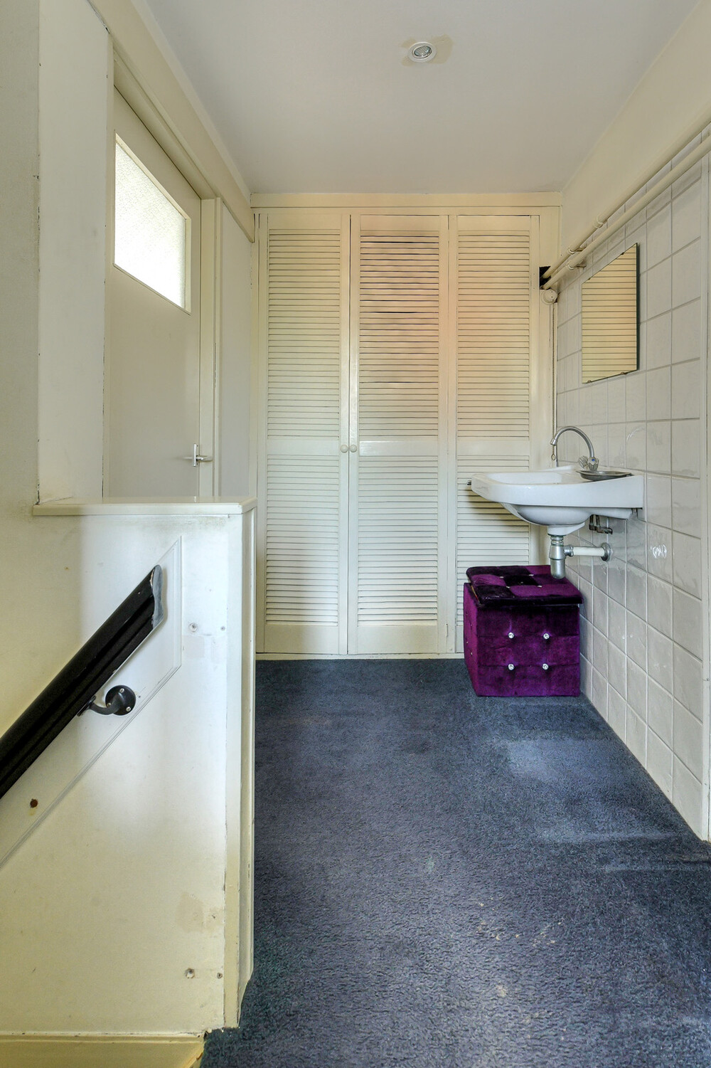 Ruime toilet met wandcloset, radiator en handwasbakje.Woonkamer