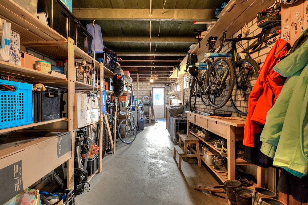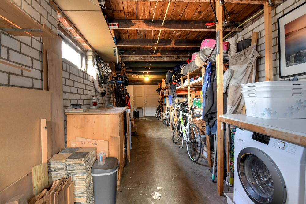 Aangebouwde ca. 11.00m diepe garage met aansluitingen t.b.v. de wasapparatuur. De garage is bereikbaar via dubbele deuren vanaf de oprit en via een stapdeur vanuit de tuin.