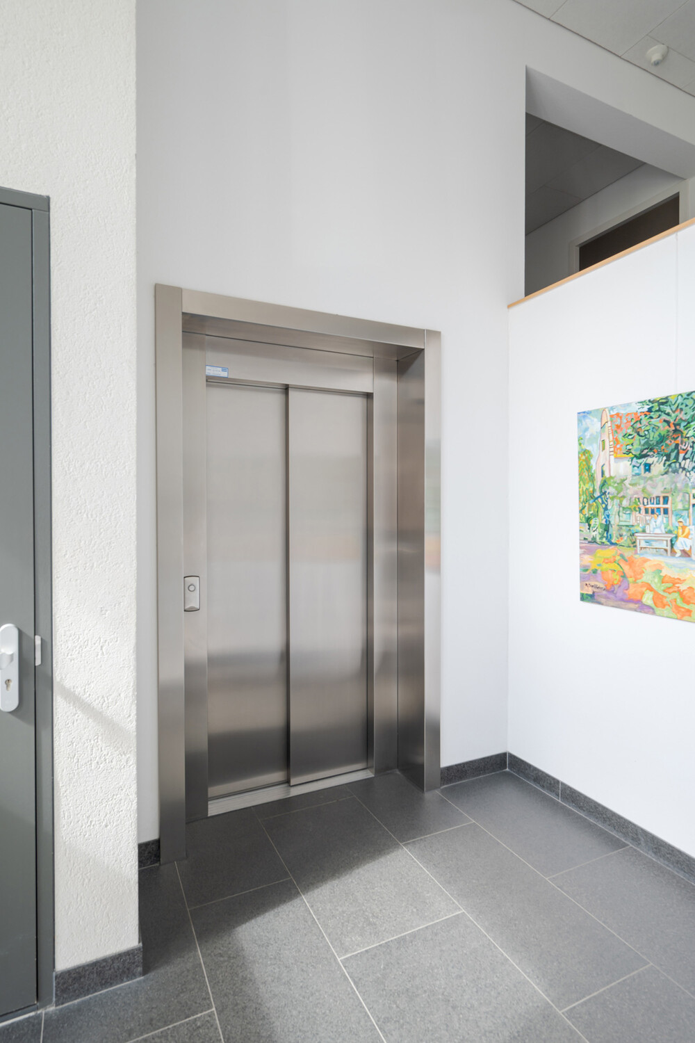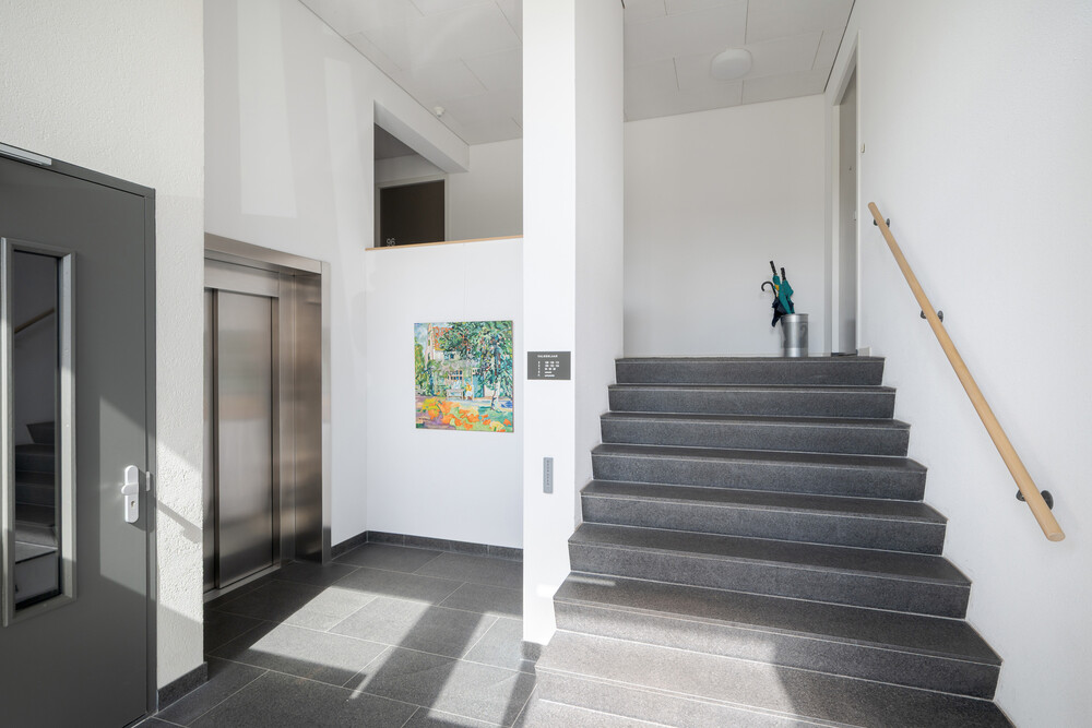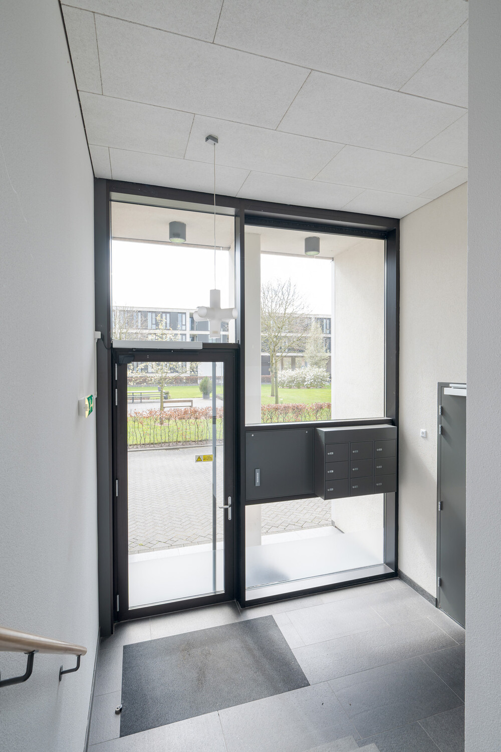 Overdekte entree met brievenbussen, bellentableau en videointercominstallatie in afsluitbare hal met toegang tot trappenhuis en liftinstallatie.BERGING en PARKEERPLAATS