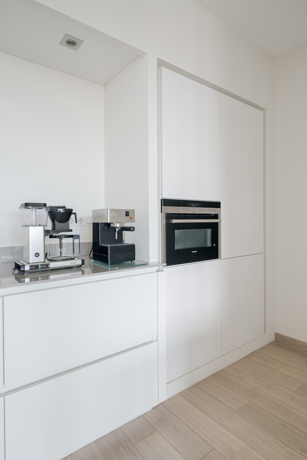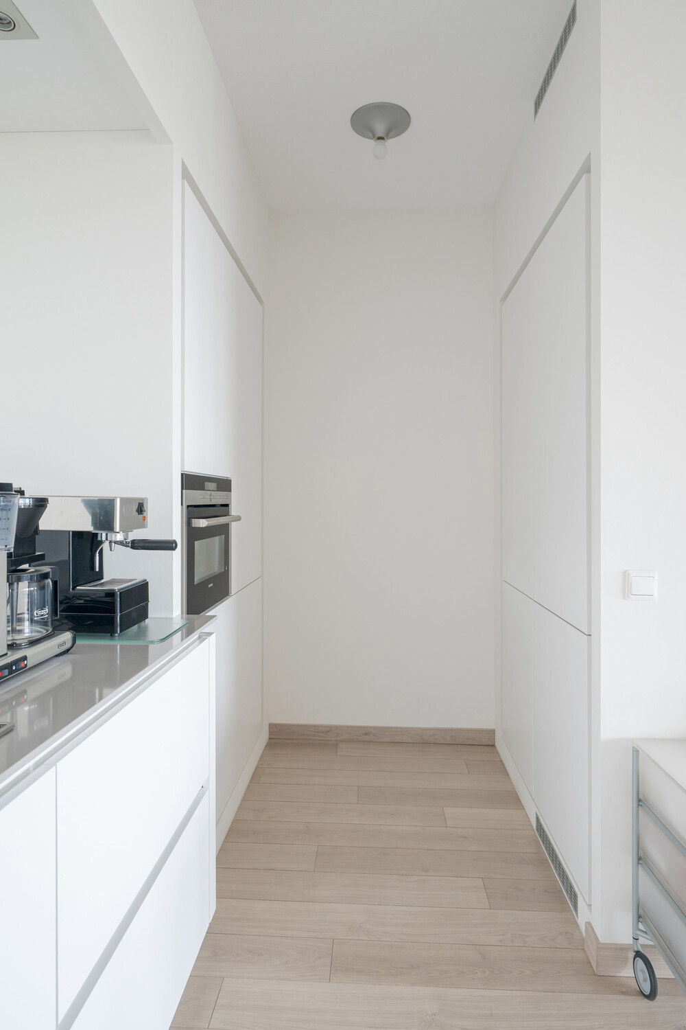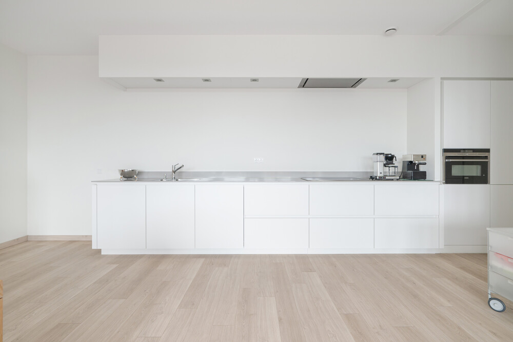 Heerlijk ruime woonkamer met open keuken (totaal ca. 7.20 x 6.60 m en ca. 2.60 x 3.55 m.) voorzien van fraaie 'eiken' laminaatvloer en moderne en luxe Frako keukeninrichting bestaande uit een aanrecht voorzien van een licht composieten blad, 1½ rvs-spoelbak, inductiekookplaat (Miele) en in plafond geïntegreerde afzuigunit, vaatwasmachine (Miele) en voldoende laden met binnenladen en kasten. Voorts een kastenwand met koelkast en vriezer (Miele) en een combi-magnetronoven (Siemens) en kastruimte.Berging/bijkeuken
