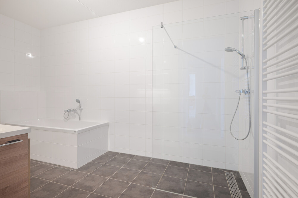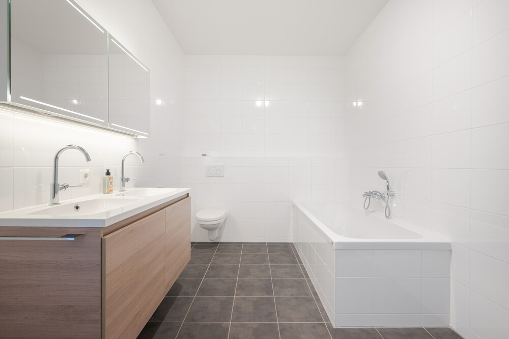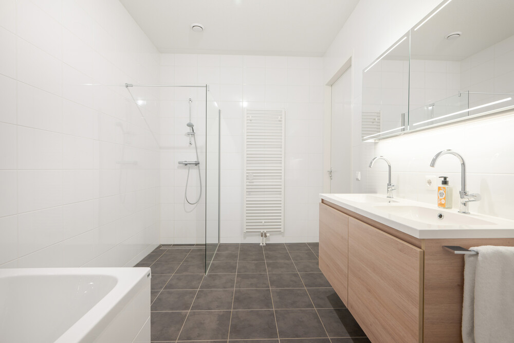 Moderne nette badkamer (ca. 2.40 x 4.30 m.) met ligbad voorzien van thermostaatkraan, een inloopdouche voorzien van hardglazen scherm en thermostaatkraan, een badkamermeubel met 2 wastafels, kastruimte en een spiegel alsmede een handdoekradiator.