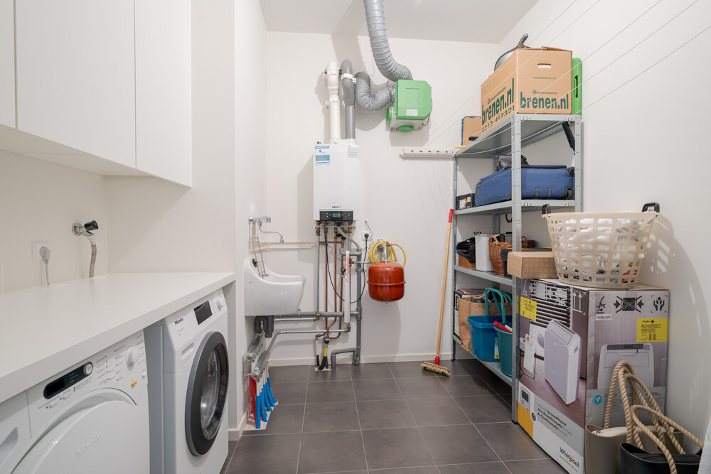 Via de gang toegang tot berging/bijkeuken (ca. 2.55 x 2.00/2.65 m.) met cv-ketel, mechanische ventilatie-unit, gootsteen, Frako- inbouwkasten, werkblad en aansluitingen t.b.v. de wasapparatuur.Hoofdslaapkamer