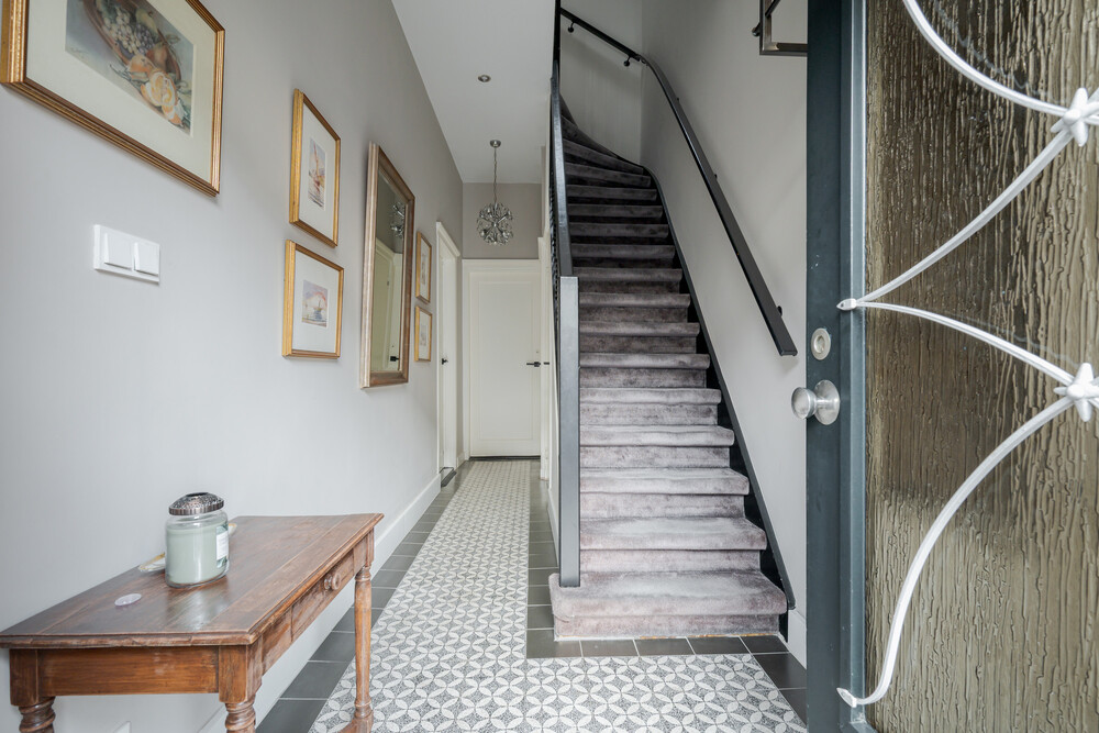 Ruime entree/hal met trapopgang naar de eerste verdieping, een vaste kast met aansluitpunten voor de wasapparatuur en toegang tot de kelderkast, het toilet en de woonkamer.Toilet