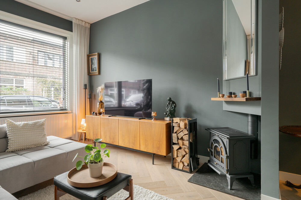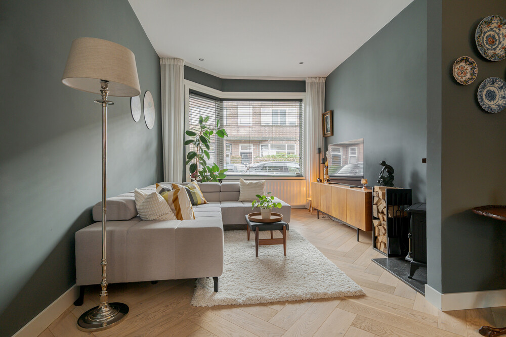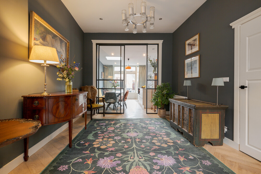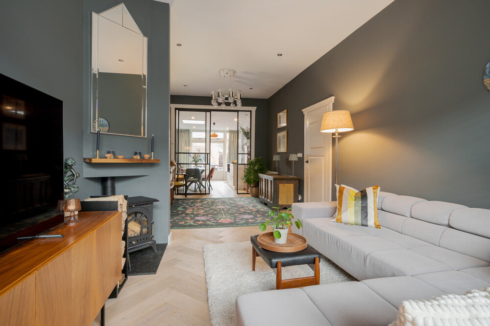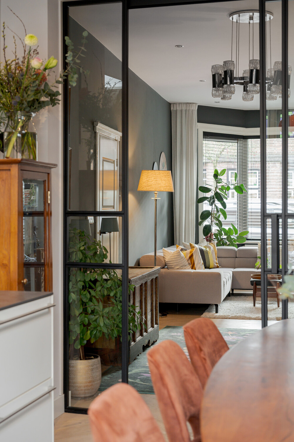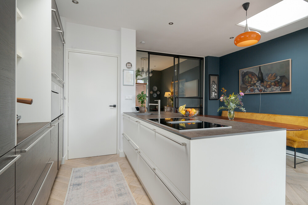 De ruime en sfeervolle woonkamer met erker en open haard is middels stalen zwarte deuren af te sluiten van de gezellige woonkeuken.Keuken