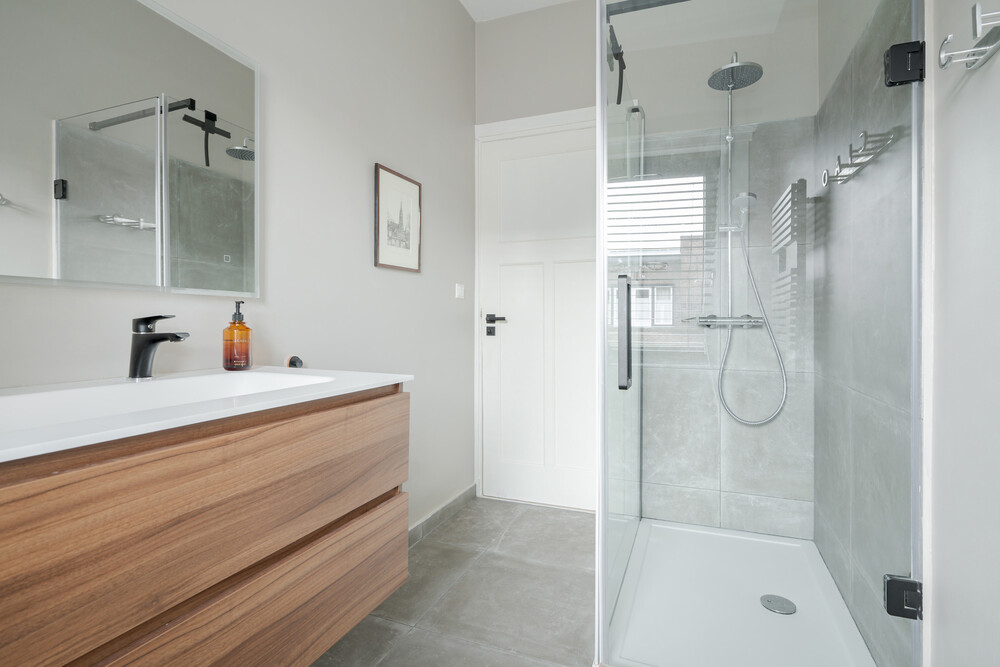 De badkamer is voorzien van een inloopdouche, een dubbel wastafelmeubel en een designradiator.