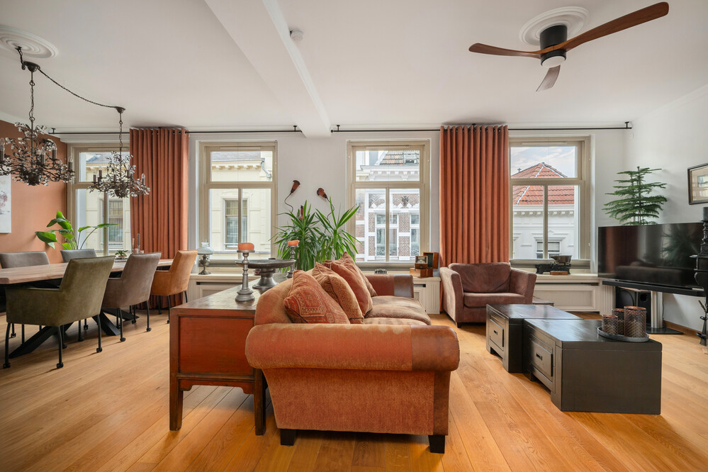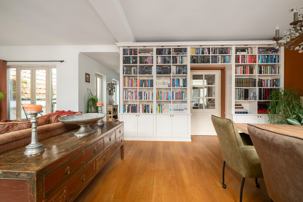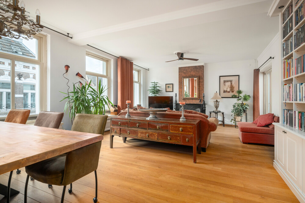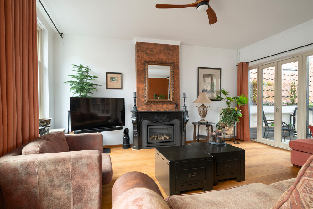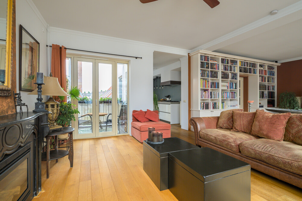 De sfeervolle woonkamer is aan de voorzijde gelegen, vanuit deze ruimte heeft u prachtig zicht op de historische gevels van de Veemarktstraat. In de schouw is een gashaard geplaatst. Ook treft u een op maat gemaakt wandmeubel, stucplafonds met sierlijsten en een fraaie parketvloer. Openslaande deuren bieden toegang tot een gezellig terras.Keuken