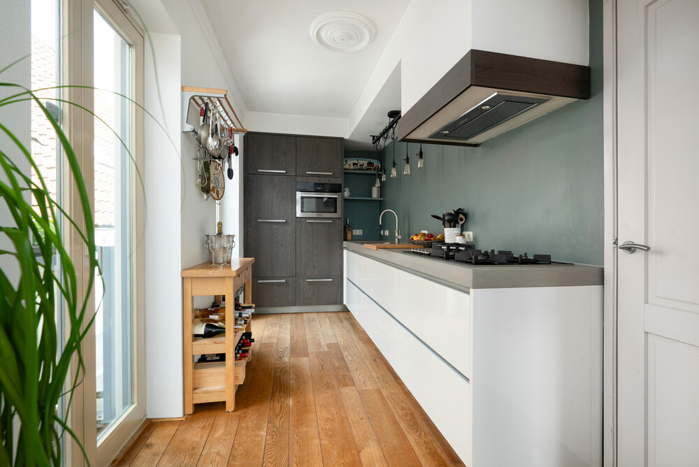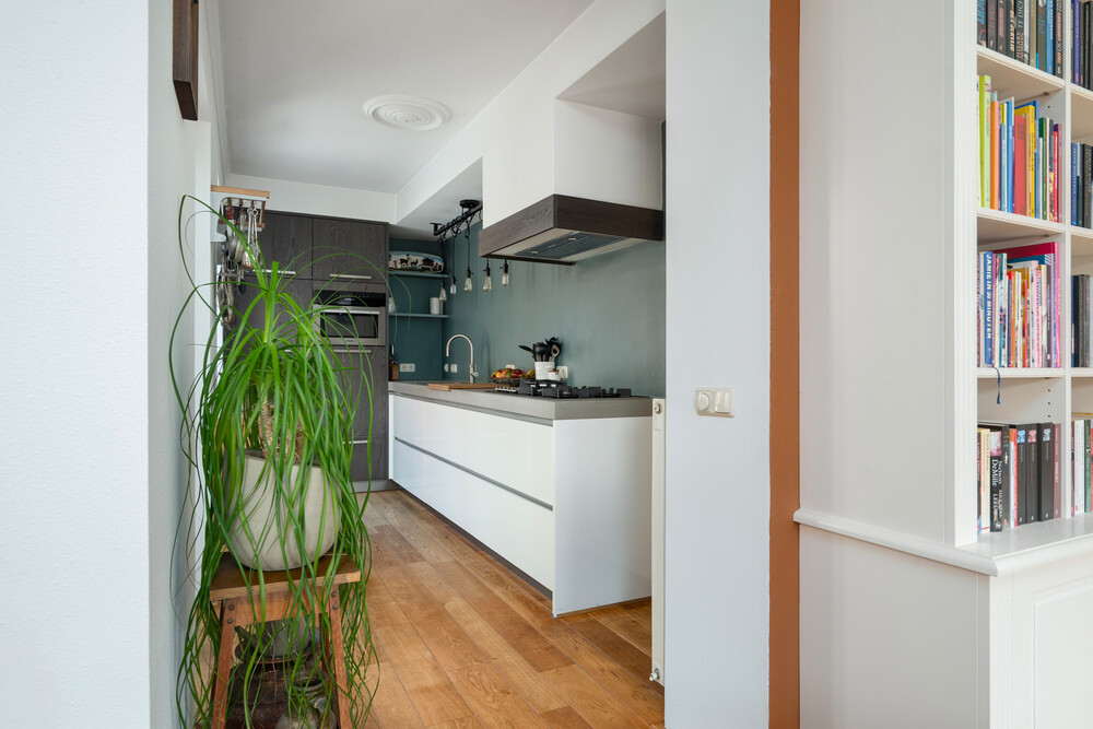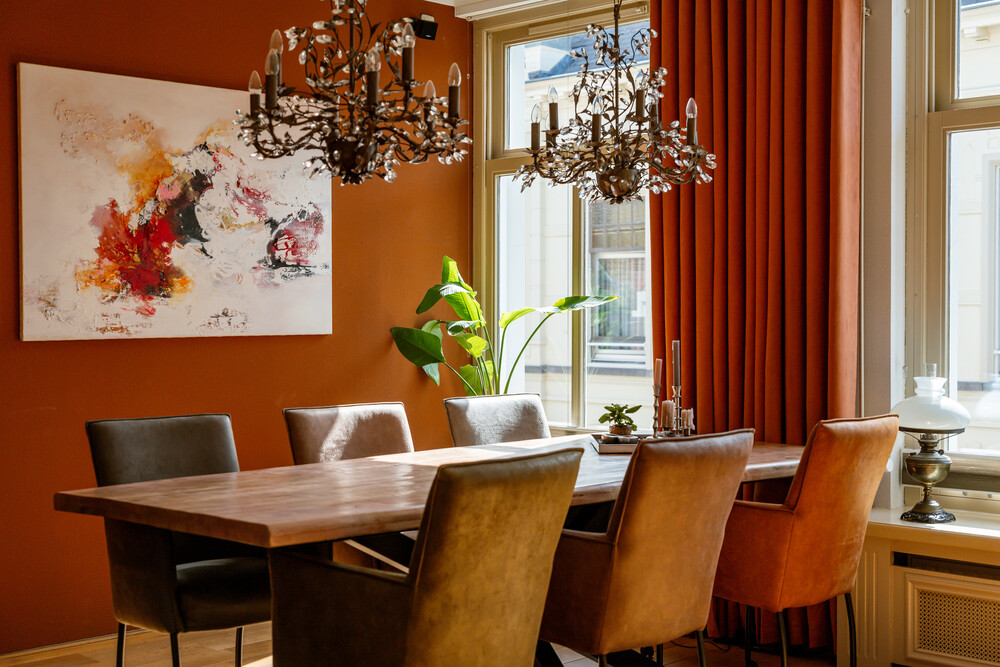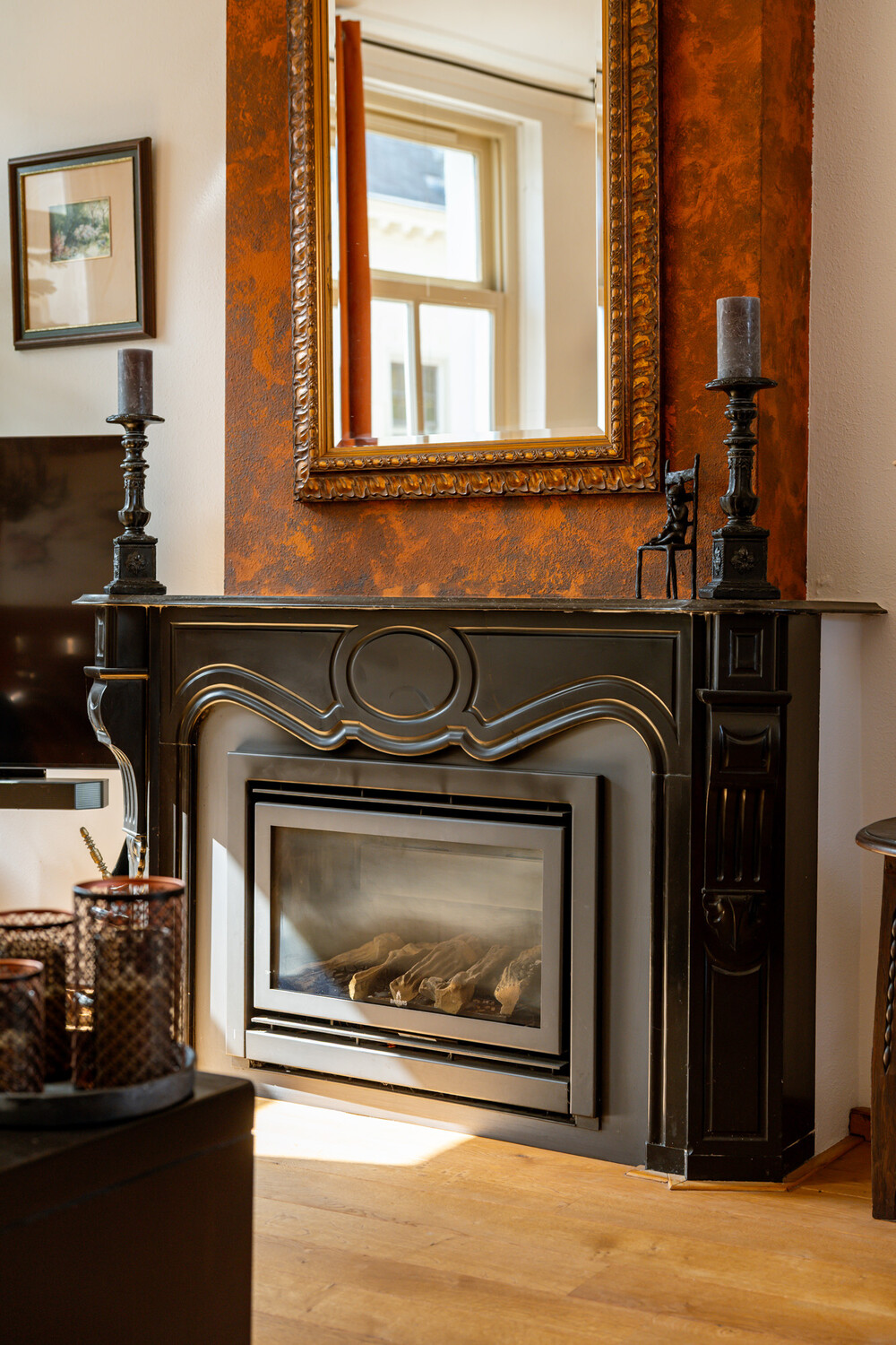 De sfeervolle woonkamer is aan de voorzijde gelegen, vanuit deze ruimte heeft u prachtig zicht op de historische gevels van de Veemarktstraat. In de schouw is een gashaard geplaatst. Ook treft u een op maat gemaakt wandmeubel, stucplafonds met sierlijsten en een fraaie parketvloer. Openslaande deuren bieden toegang tot een gezellig terras.Keuken